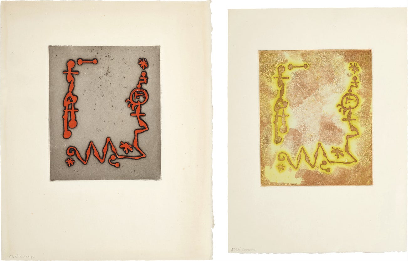 Annotated 'essai couleur' (color test) and 'essai encrage' (inking test) respectively by Piero Crommelynck in pencil (both unique working proofs without the text/poem, there were only 6-10 impressions printed with text), printed by the artist and Stanley William Hayter at Atelier 17, New York, both unframed.