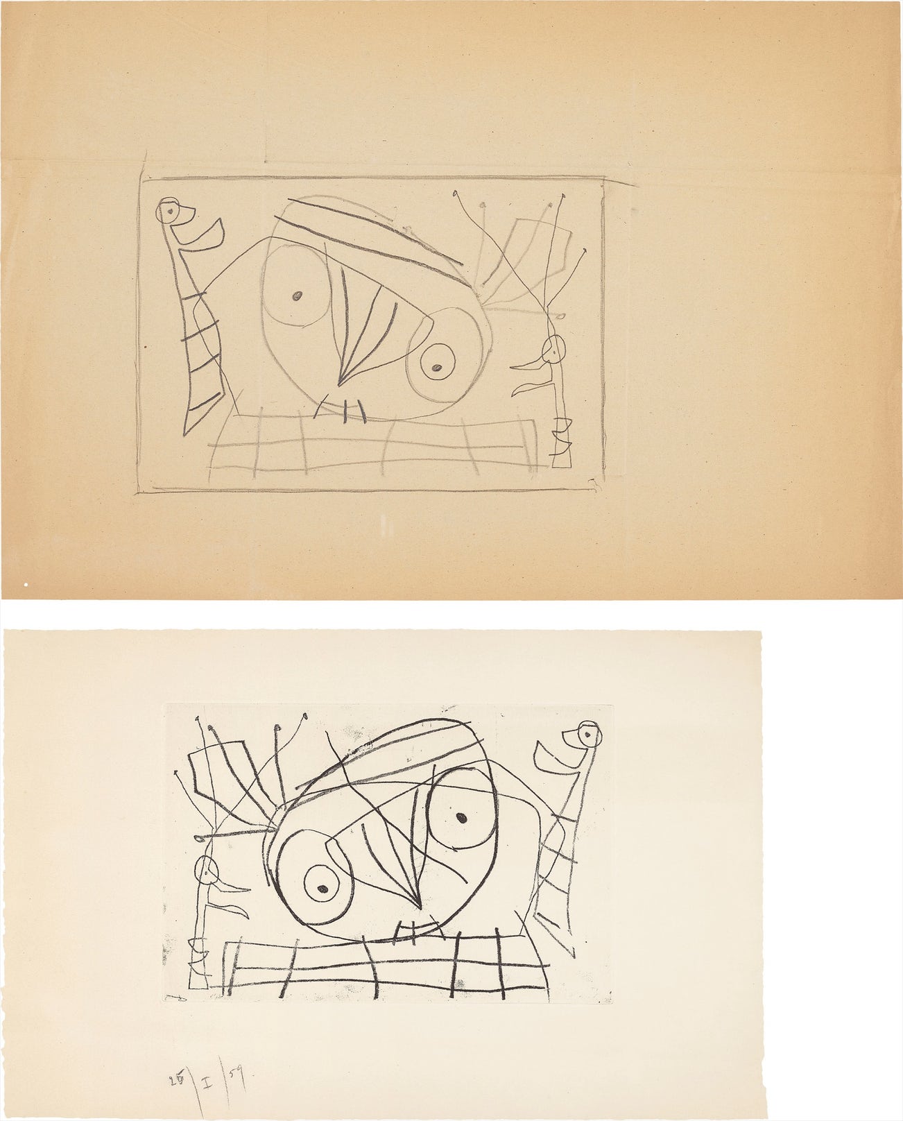 One dated '25/I/59' by Miró in pencil (the preparatory drawing and a related working proof impression after the drawing was transferred to a copper plate, the image was never editioned), both unframed.