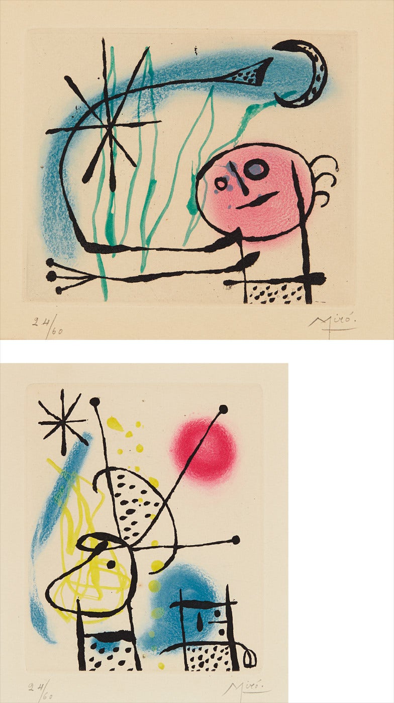 Two etchings and aquatints in colors, on Rives BFK paper, with margins.