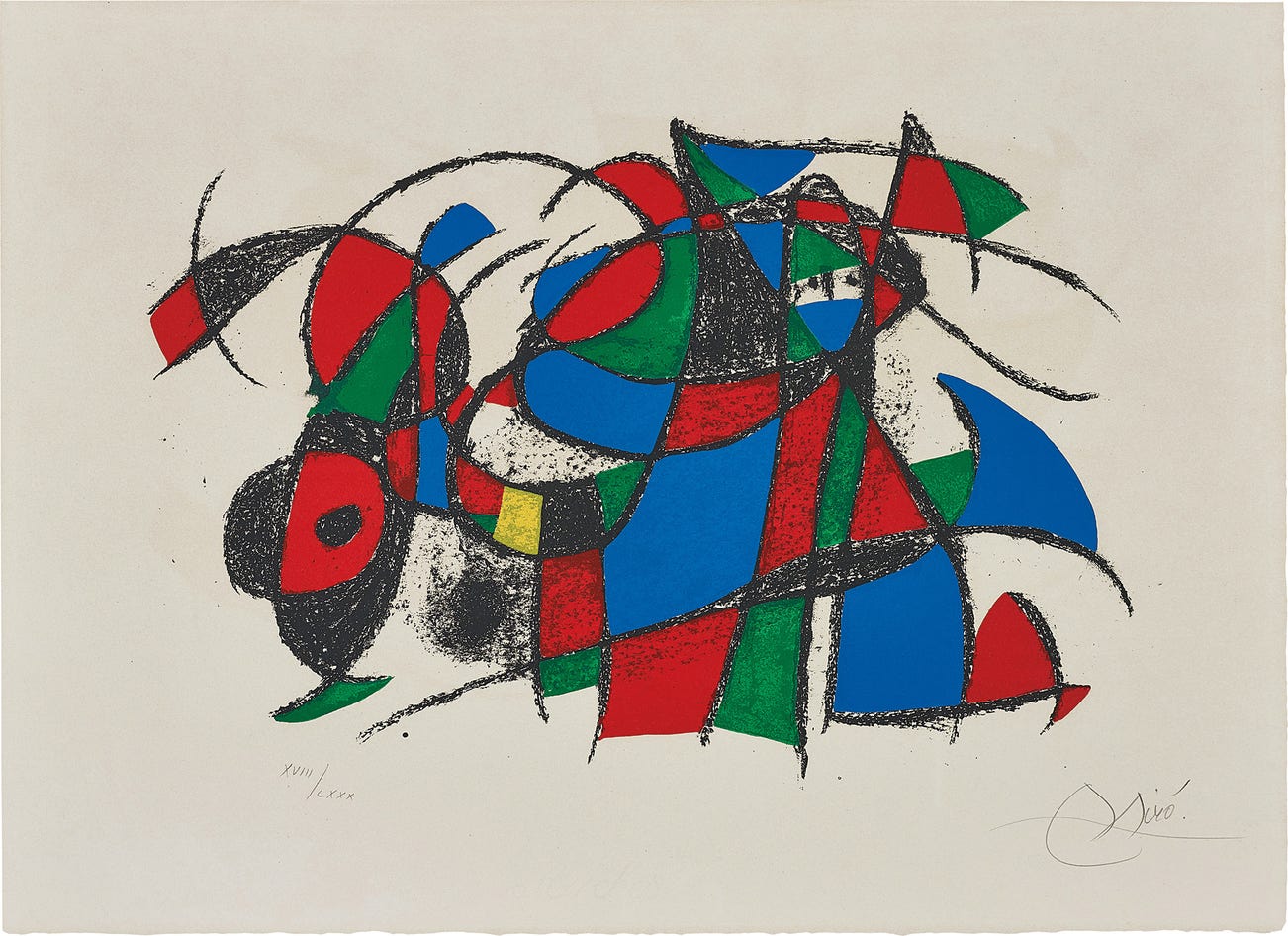 Signed and numbered XVIII/LXXX in pencil (one of 80 impressions in Roman numerals aside from the deluxe book edition of 150), published by Maeght, Paris, framed.