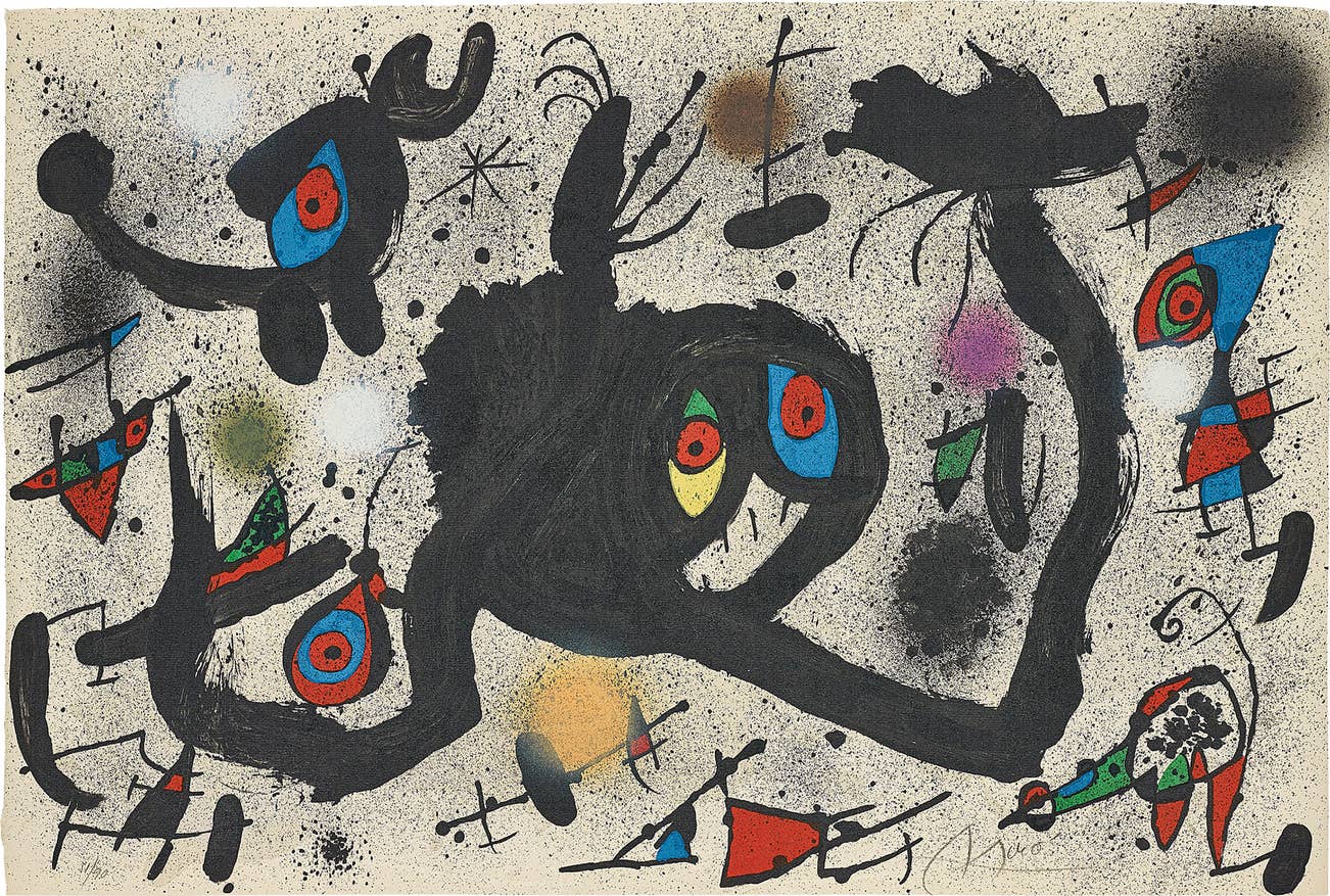 Signed and numbered 51/90 in pencil (there were also 20 copies printed from the black state and hand-colored with wax-crayon, 15 numbered in Roman numerals and 5 lettered A-E), authenticated by Rosa Maria Malet, director of the Fundació Joan Miró, Barcelona on the reverse and dated '11/XII/2013', published by Mallorca Daily Bulletin, Palma de Mallorca, framed.