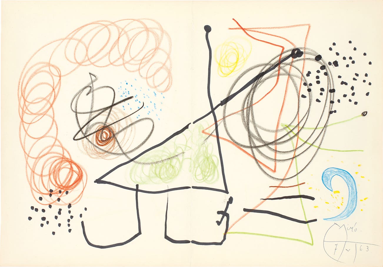 Executed on May 7, 1963, this work is accompanied by a certificate of authenticity issued by ADOM (Association pour la Défense de l'œuvre de Joan Miró).