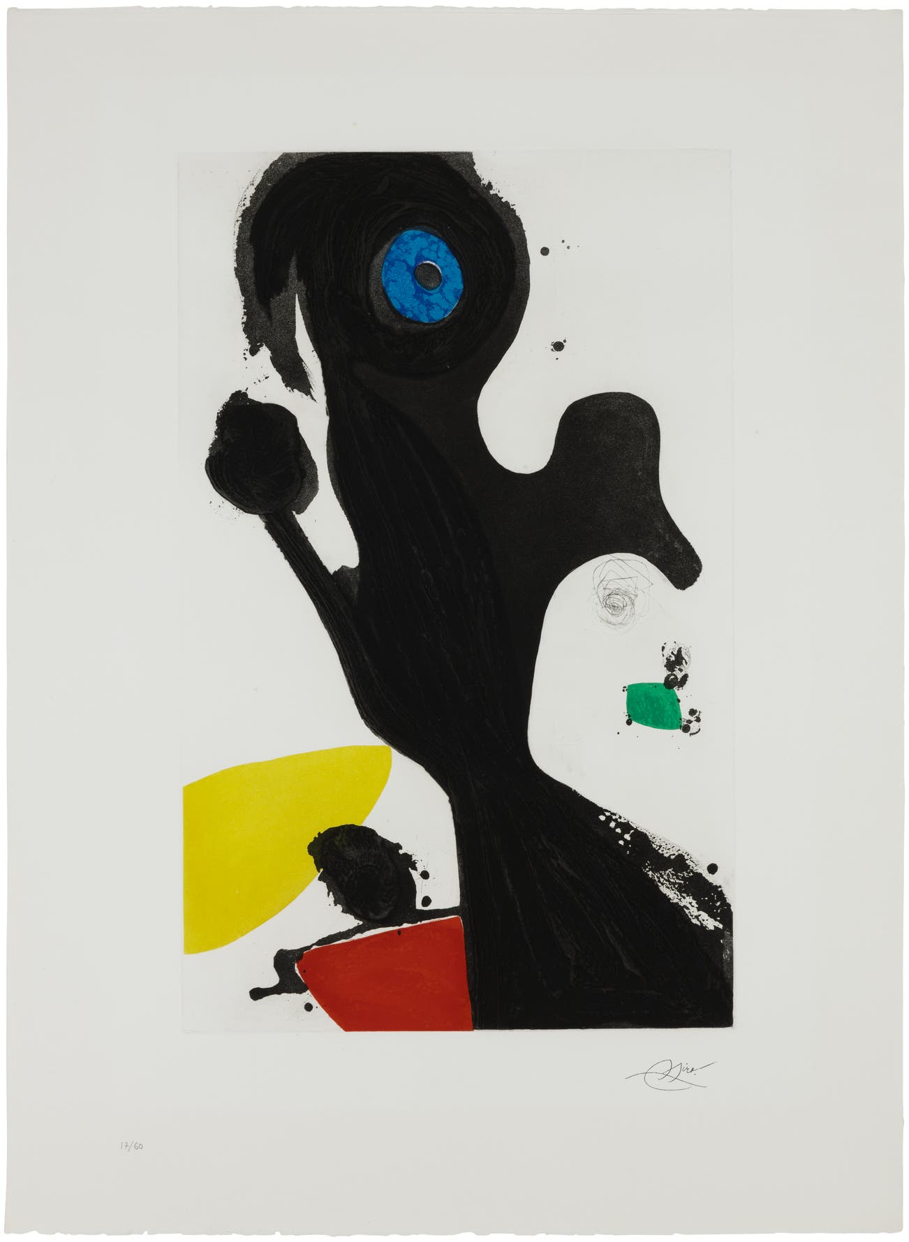 Stamp-signed in black ink and numbered 17/60 in pencil (there were also 7 hors commerce impressions in Roman numerals), signed in pencil by Emilio F. Miró (the artist's son and administrator of the Estate of Joan Miró) on a stamped Certificate of Authenticity on the reverse, published by Daniel Lelong, Paris, framed.