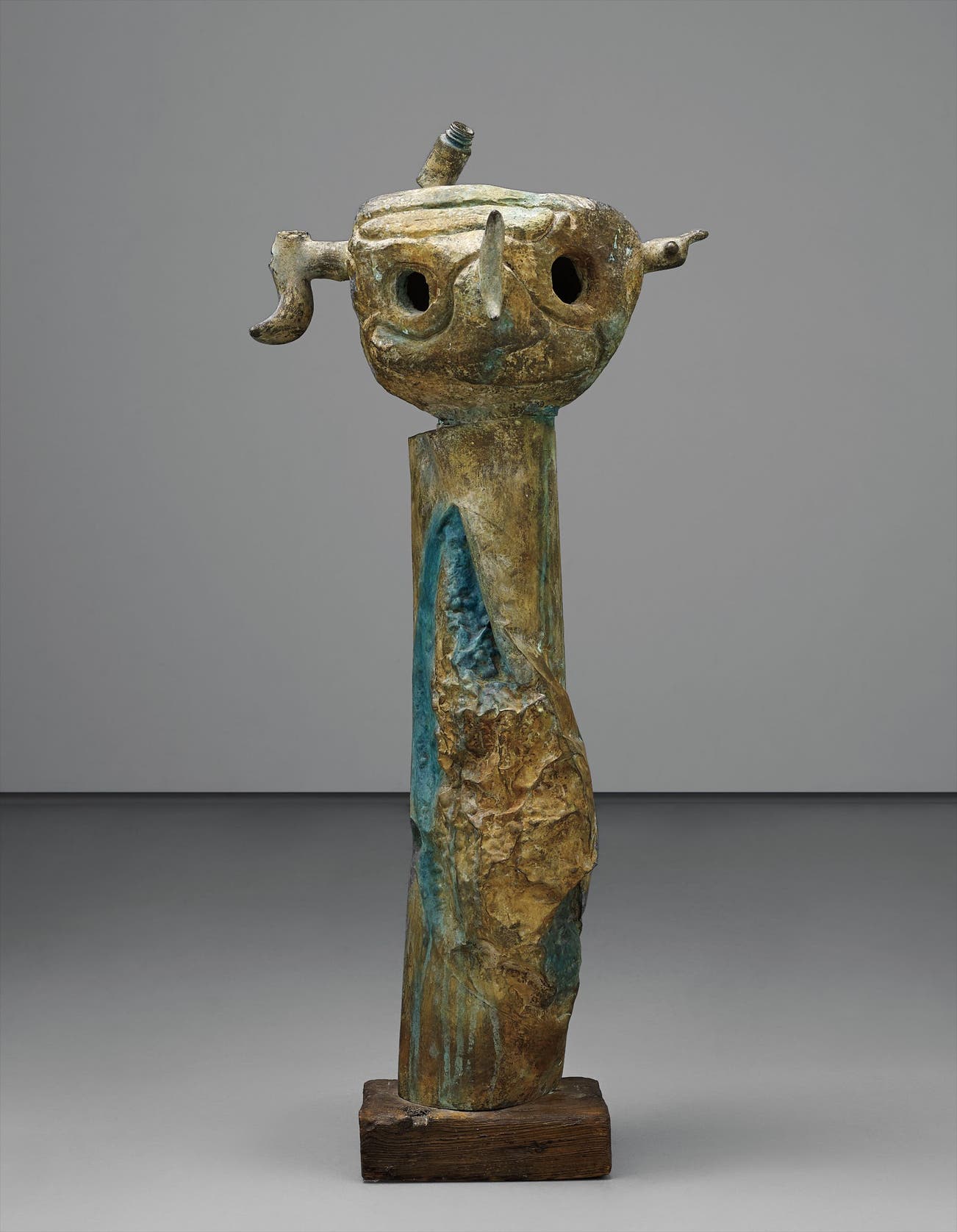 There is a head, anthropomorphized by deep, hollowed eyes and a few delicately incised lines that suggest cheeks, even a smile perchance. Miscellaneous objects protrude from this head, an oblong item as a nose, jagged tools as ears and an empty pill bottle perched delicately – perhaps as a hat. Beneath this playfulness is an arguably more monolithic form, bending slightly to produce an amorphous body for the head above. The entire figure stands on a humble, uneven wooden base. The rusty, oxidized hue of the bronze is akin to terracotta, with a slash of deep blue being the only break in color. Cast in bronze at the Parellada workshop in Barcelona, this sculpture is the third from an edition of six. However, beneath this bronze lie ambiguous materials of unknown origins. Miró spent the last two decades of his life enjoying walks on the beaches near his home of Mallorca, where he would find a range of objects that he would later incorporate into his work. Figure is an assemblage of these found objects, disparate elements united and transformed by the artist’s hand.