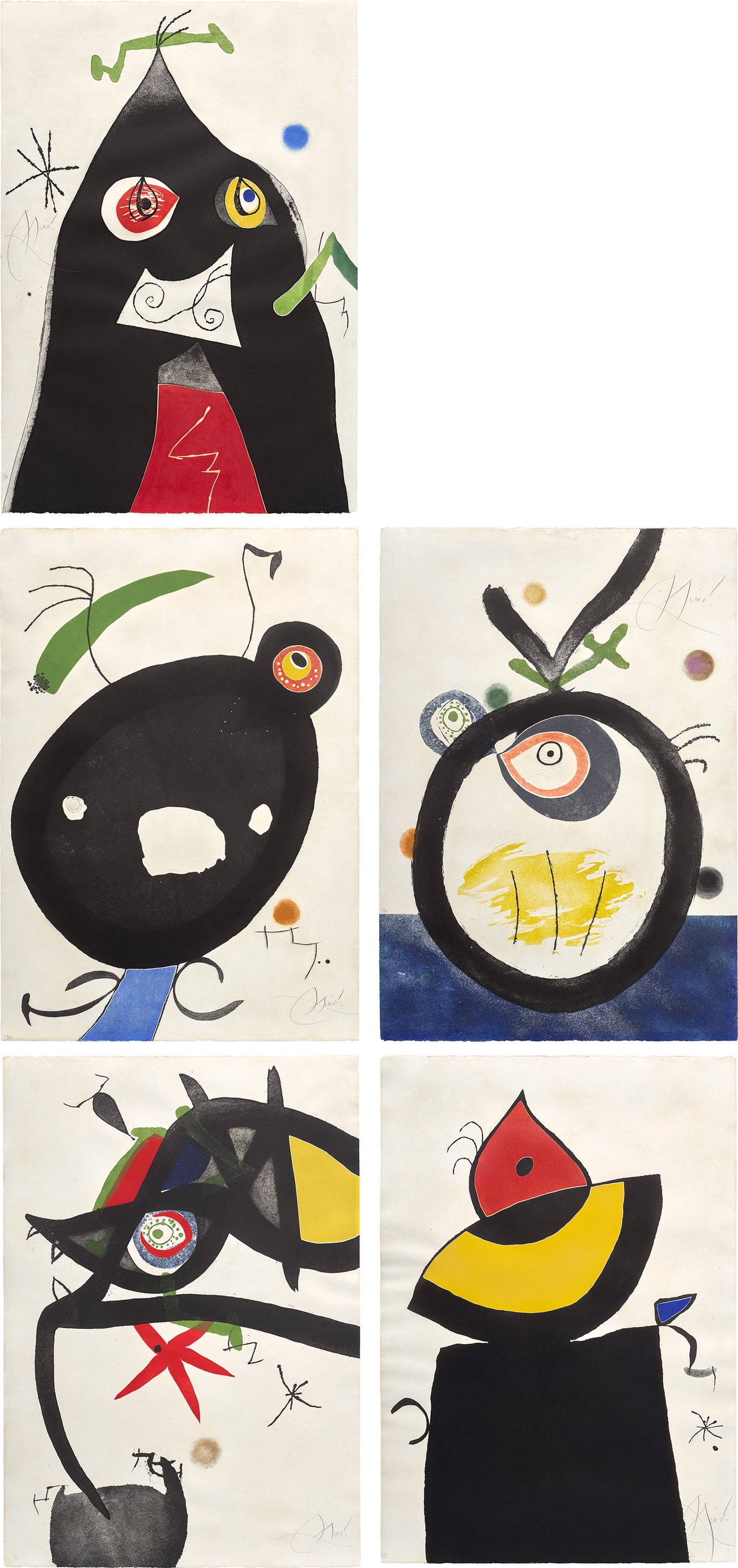The complete set of five etching and aquatints in colours, on Arches paper, the full sheets.