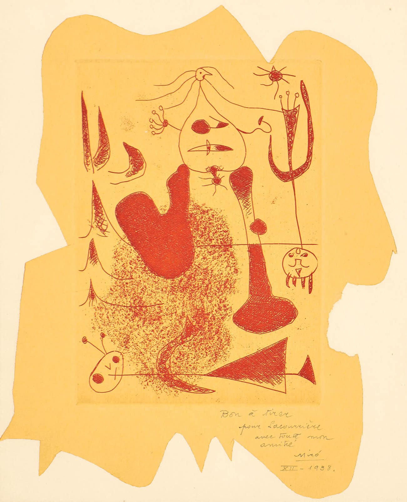 Etching in red, on cut yellow paper, Chine collé to laid Arches paper, the full sheet (without a fold), title page with Casse-Nuit title printed on the right side (changed to Sablier couché for the book edition), the poem Muttra by Alice Paalen (Rahon) printed on the reverse.