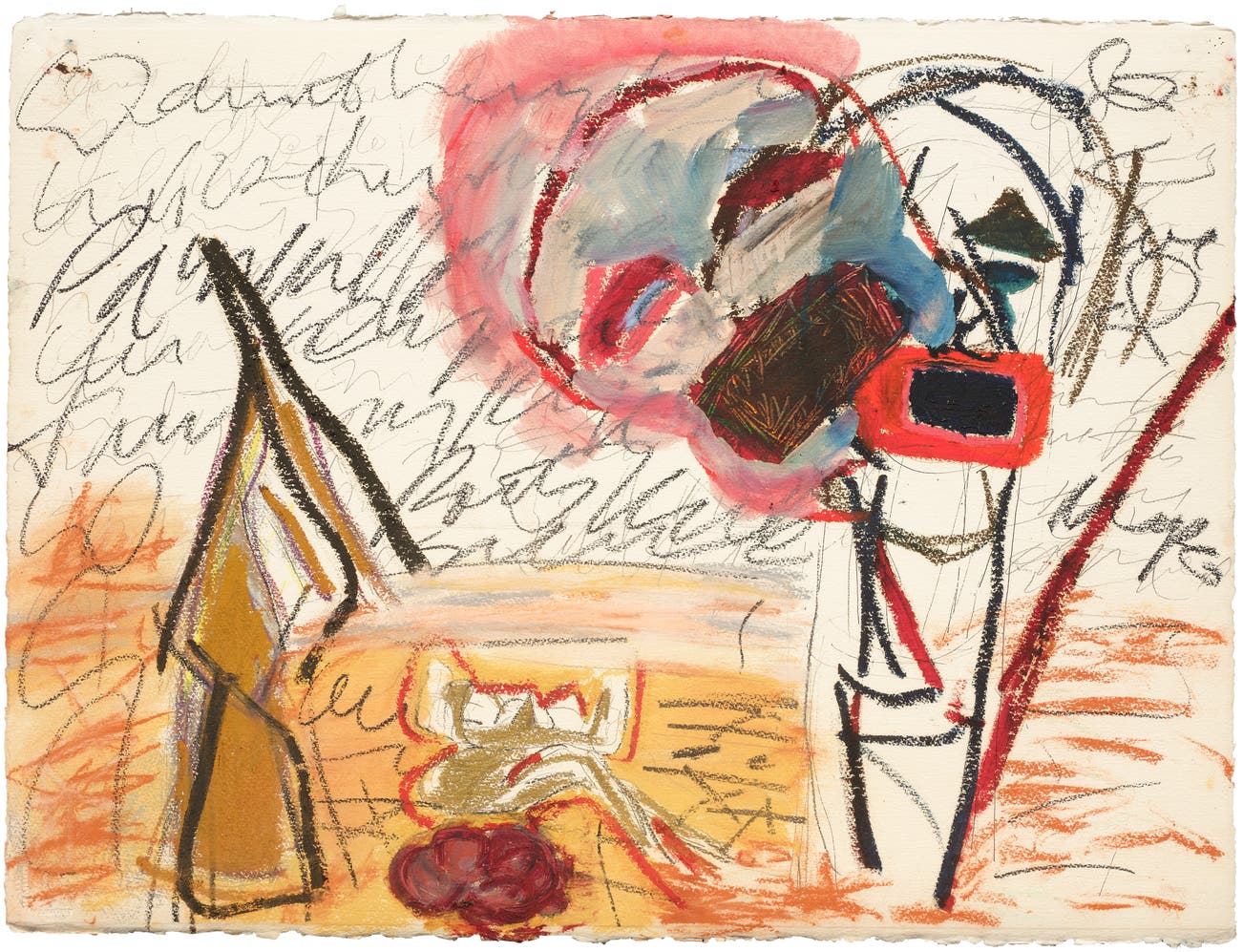 Unique mixed media drawing in colors with oil stick and graphite, on Arches watercolor paper, framed.