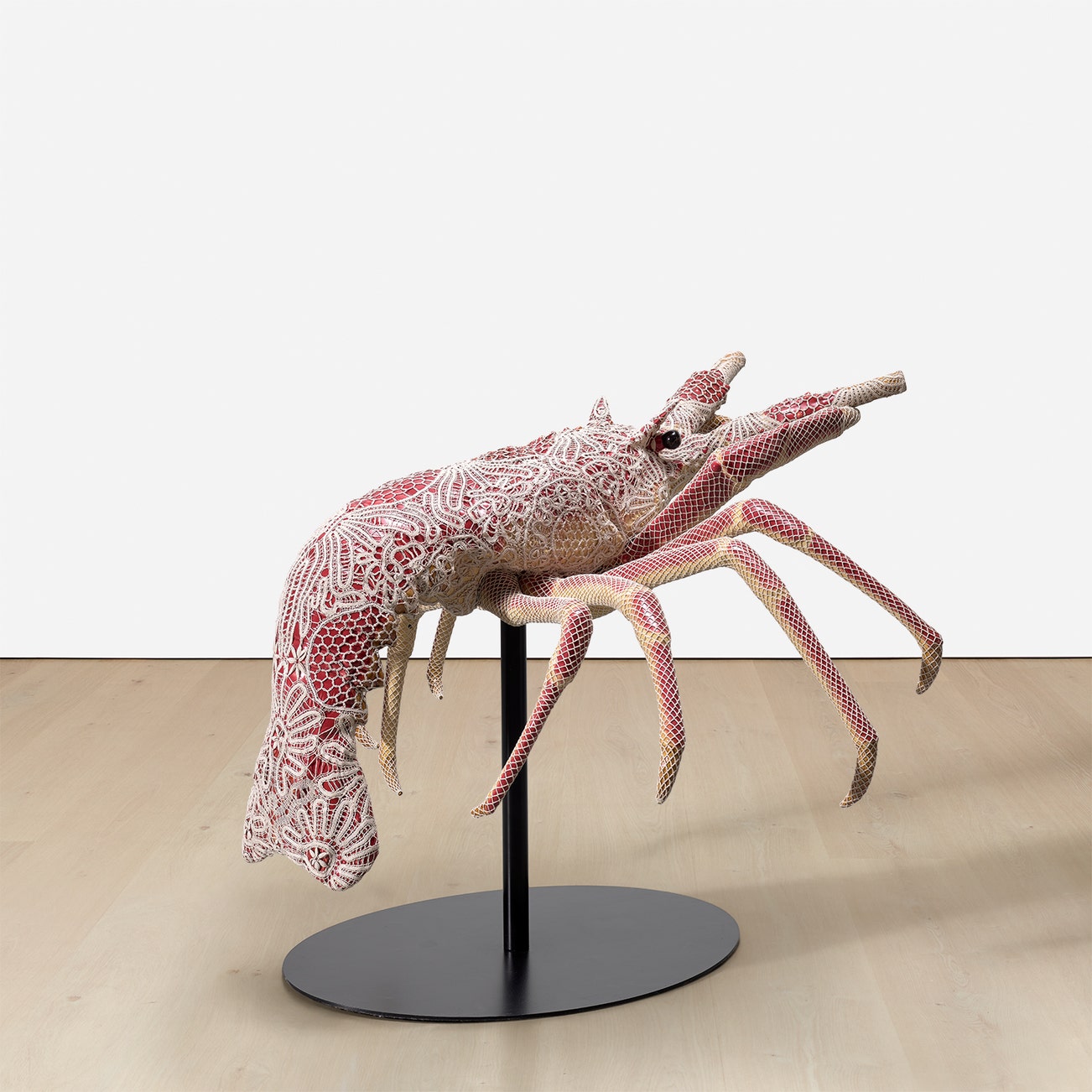 Rafael Bordalo Pinheiro faience painted with ceramic glaze, bobbin lace and handmade cotton crochet on powder-coated metal base
