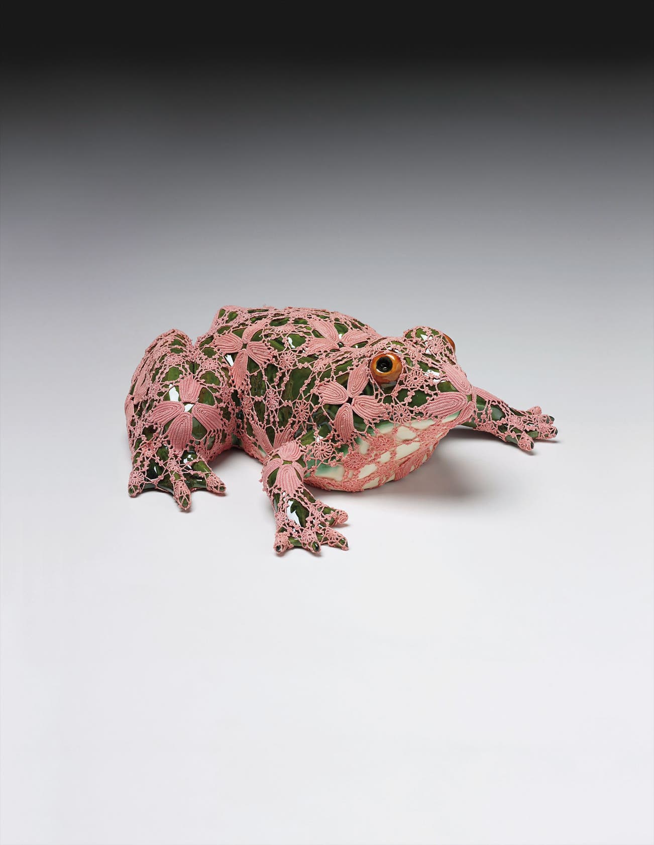 handmade wool crochet over Rafael Bordalo Pinheiro faience painted with ceramic glaze