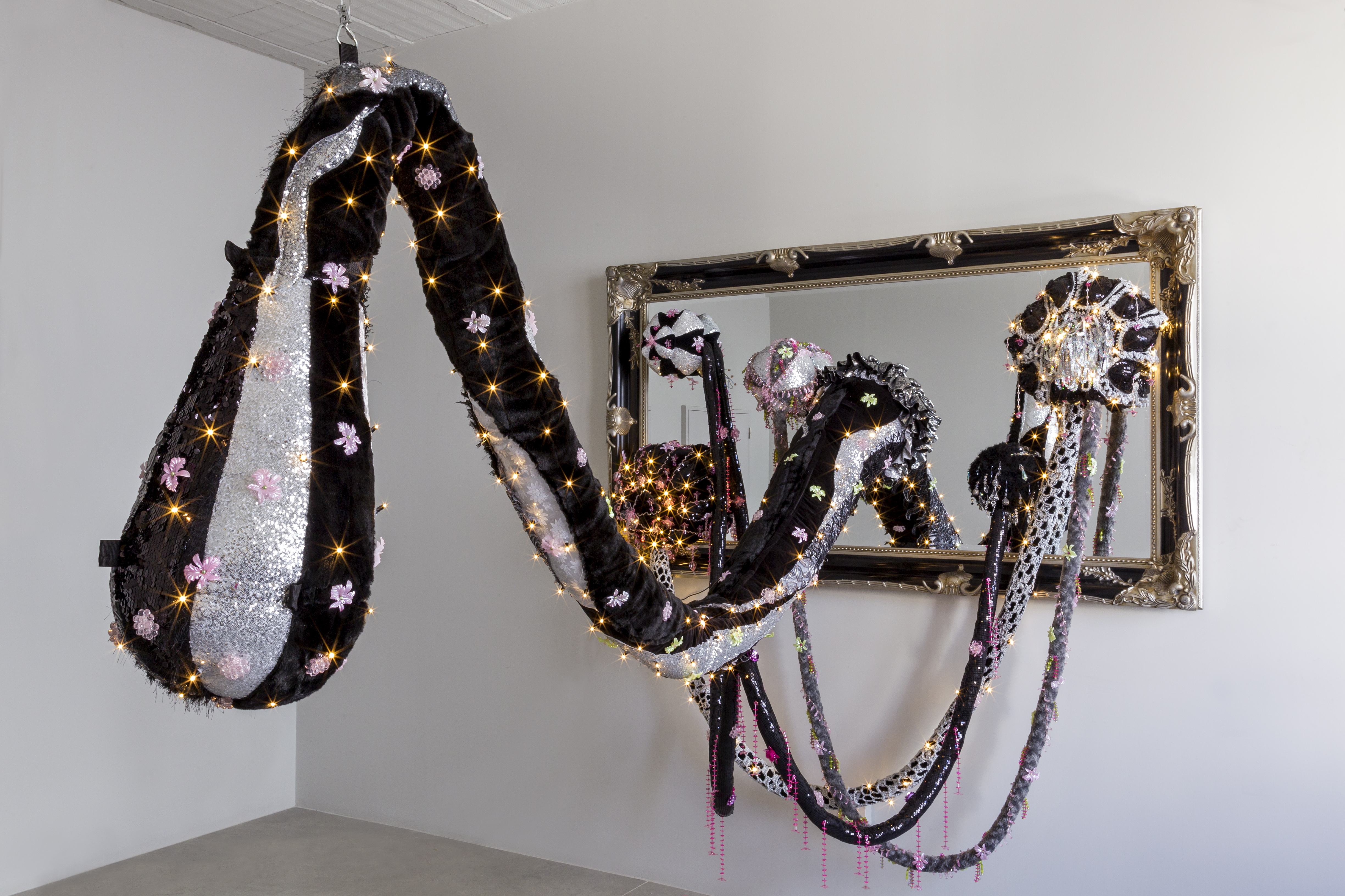 handmade woollen crochet, ornaments, LEDs, power supply unit, bevelled mirror with painted wooden frame, polyester
