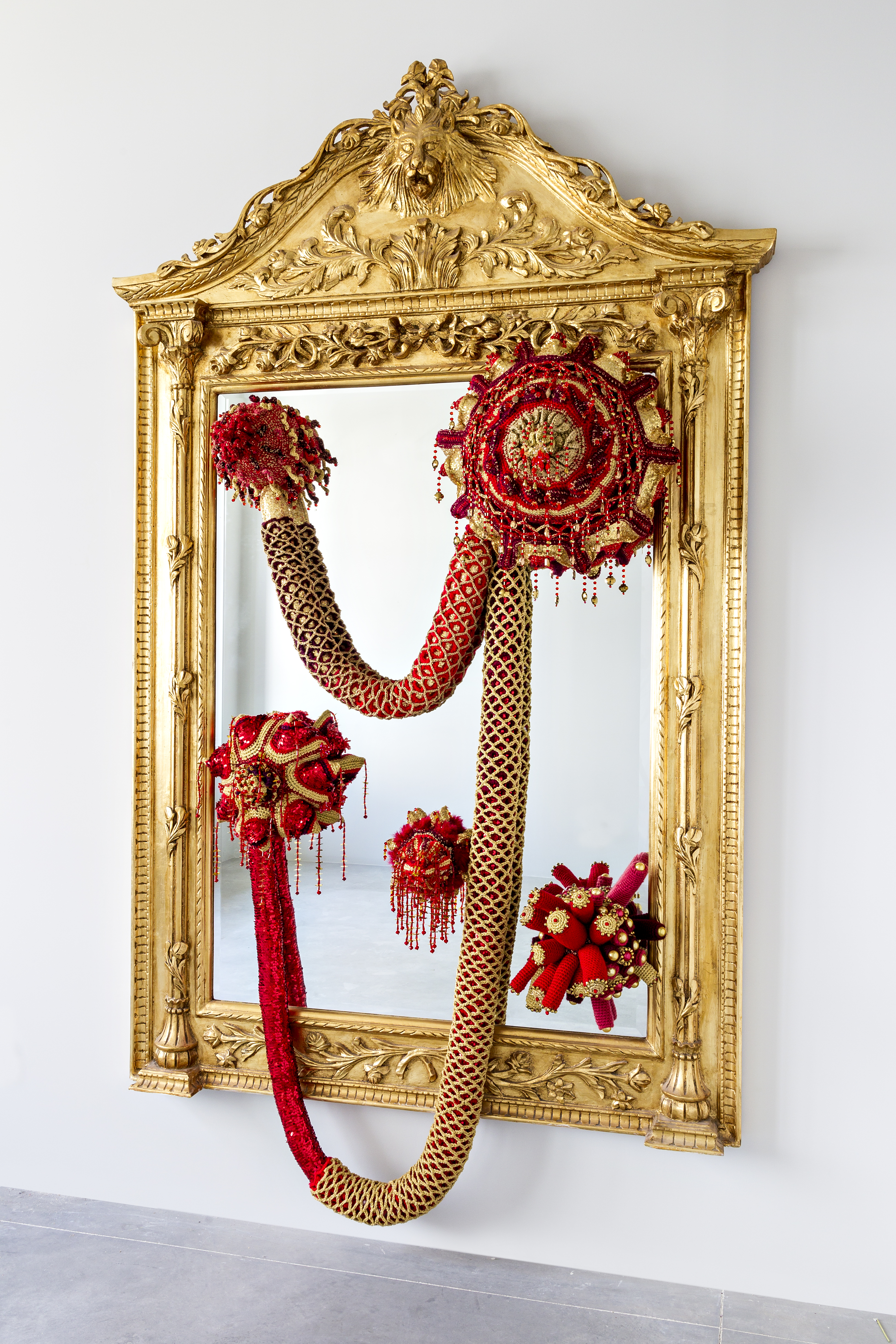 handmade woollen crochet, ornaments, bevelled mirror with Louis XV style gilt frame, polyester