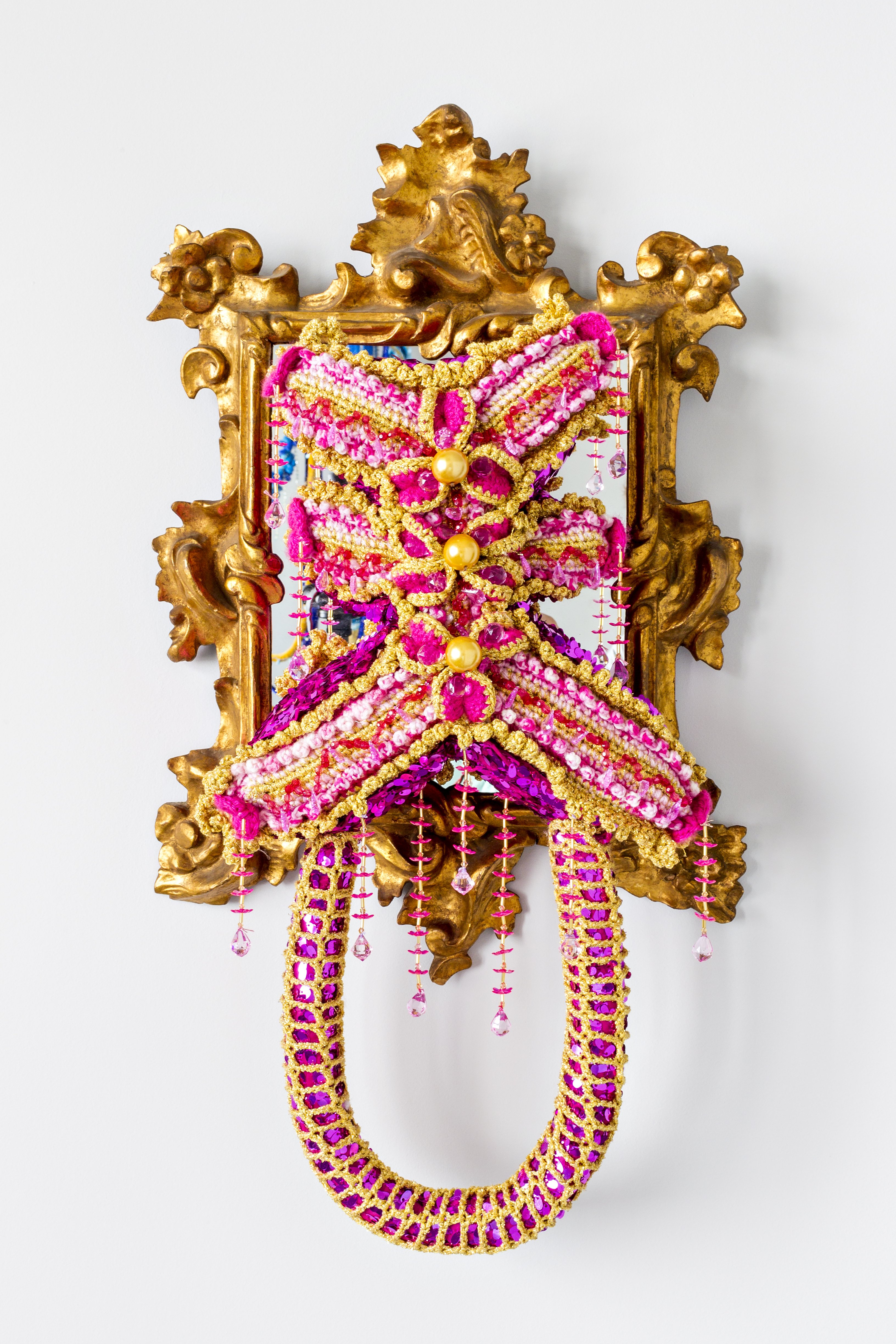 handmade woollen crochet, ornaments, gilt woodwork mirror, polyester