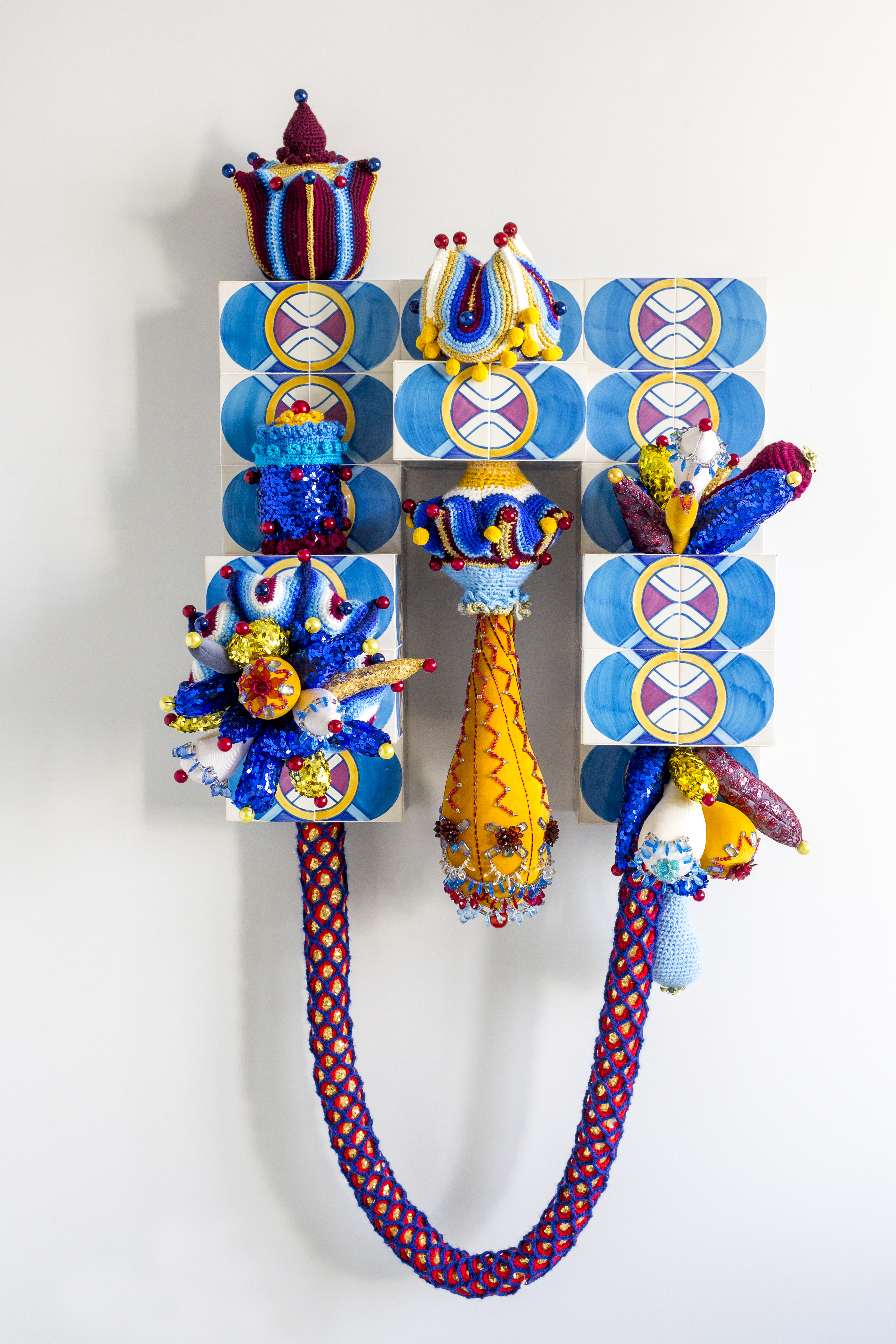 Viúva Lamego hand painted tiles, handmade woollen crochet, ornaments, LEDs, power supply unit, polyester, plywood, iron