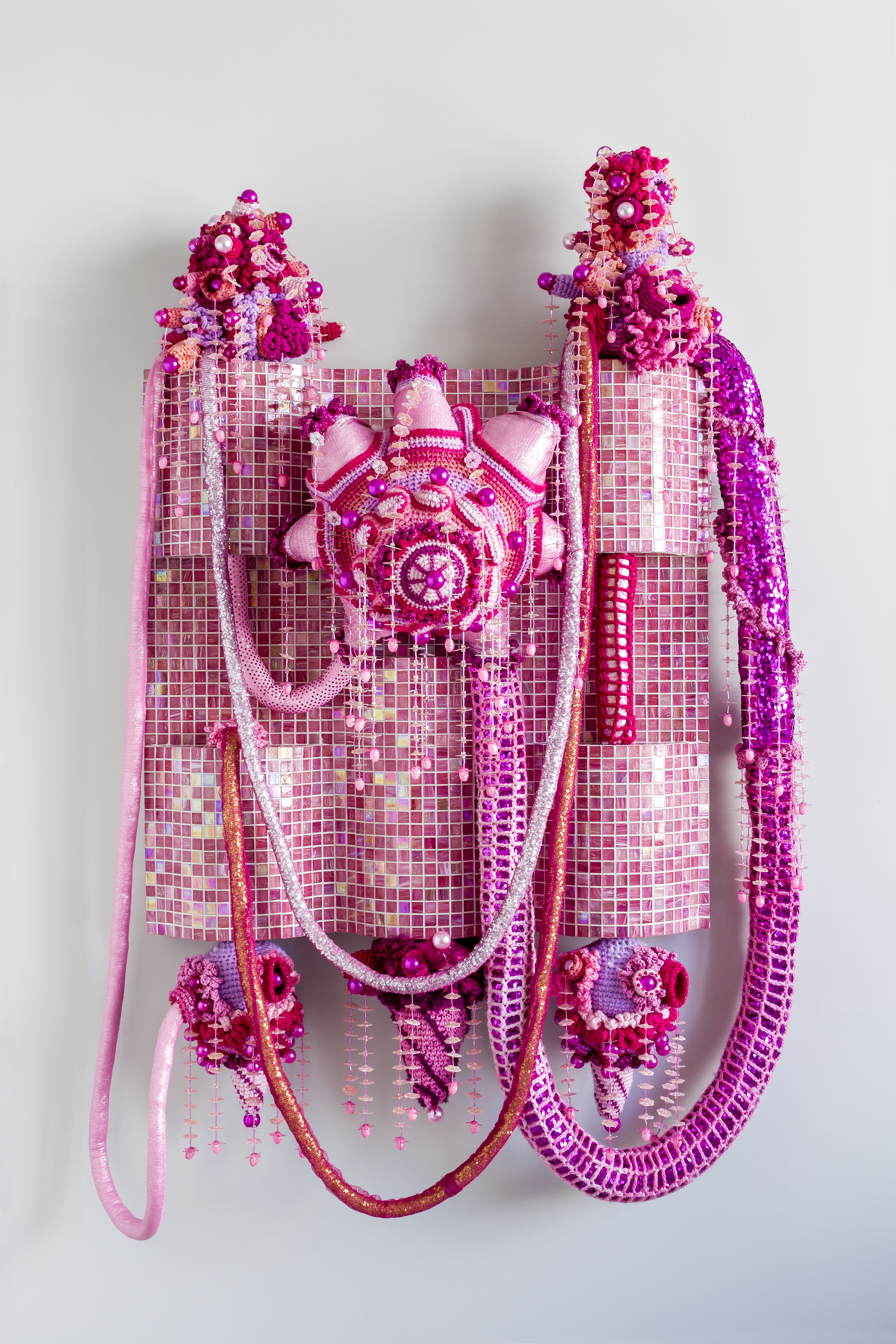 mosaic tiles, handmade woollen crochet, ornaments, LEDs, power supply unit, polyester, plywood, iron
