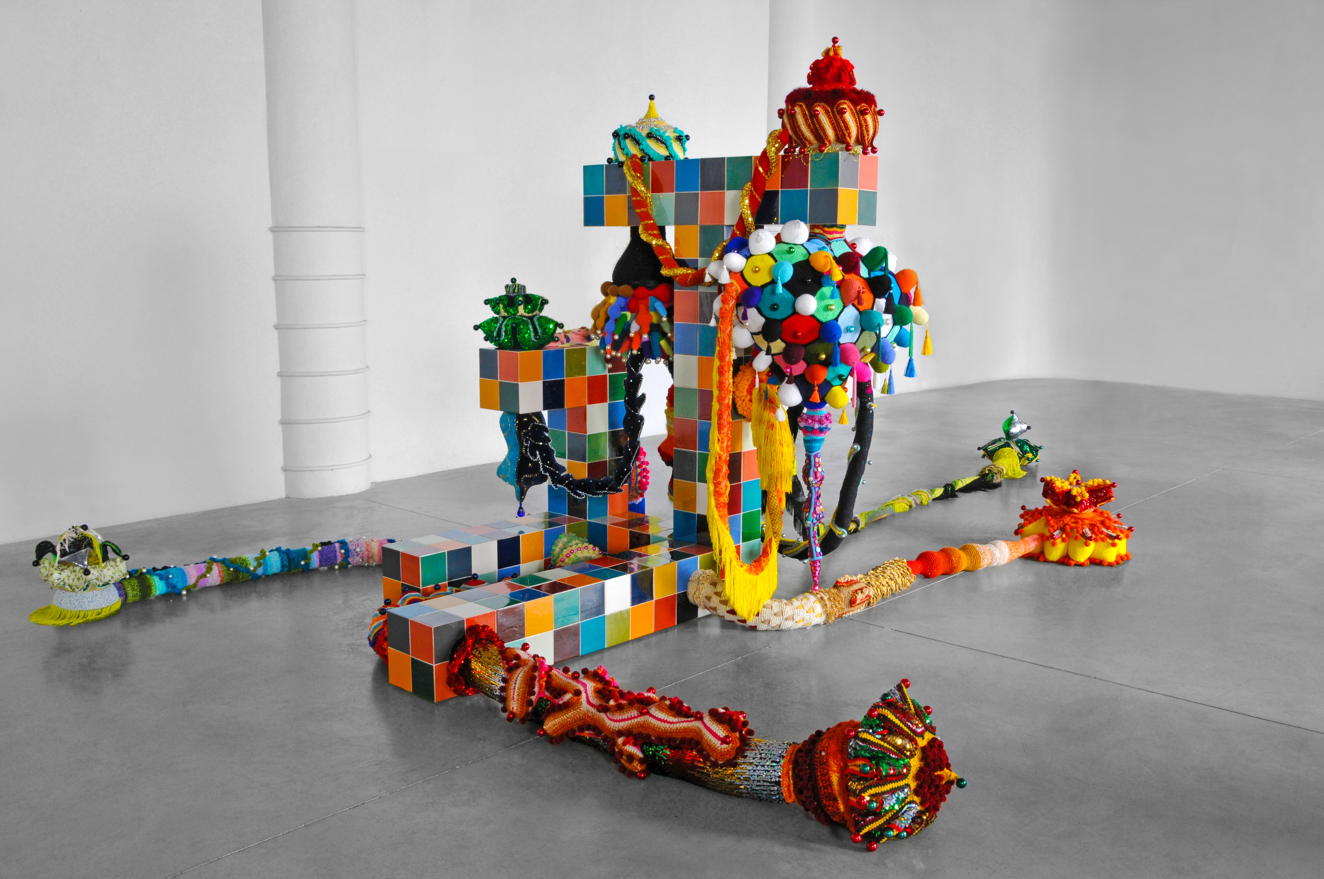 Viúva Lamego hand painted tiles, handmade woollen crochet, ornaments, polyester, MDF, iron