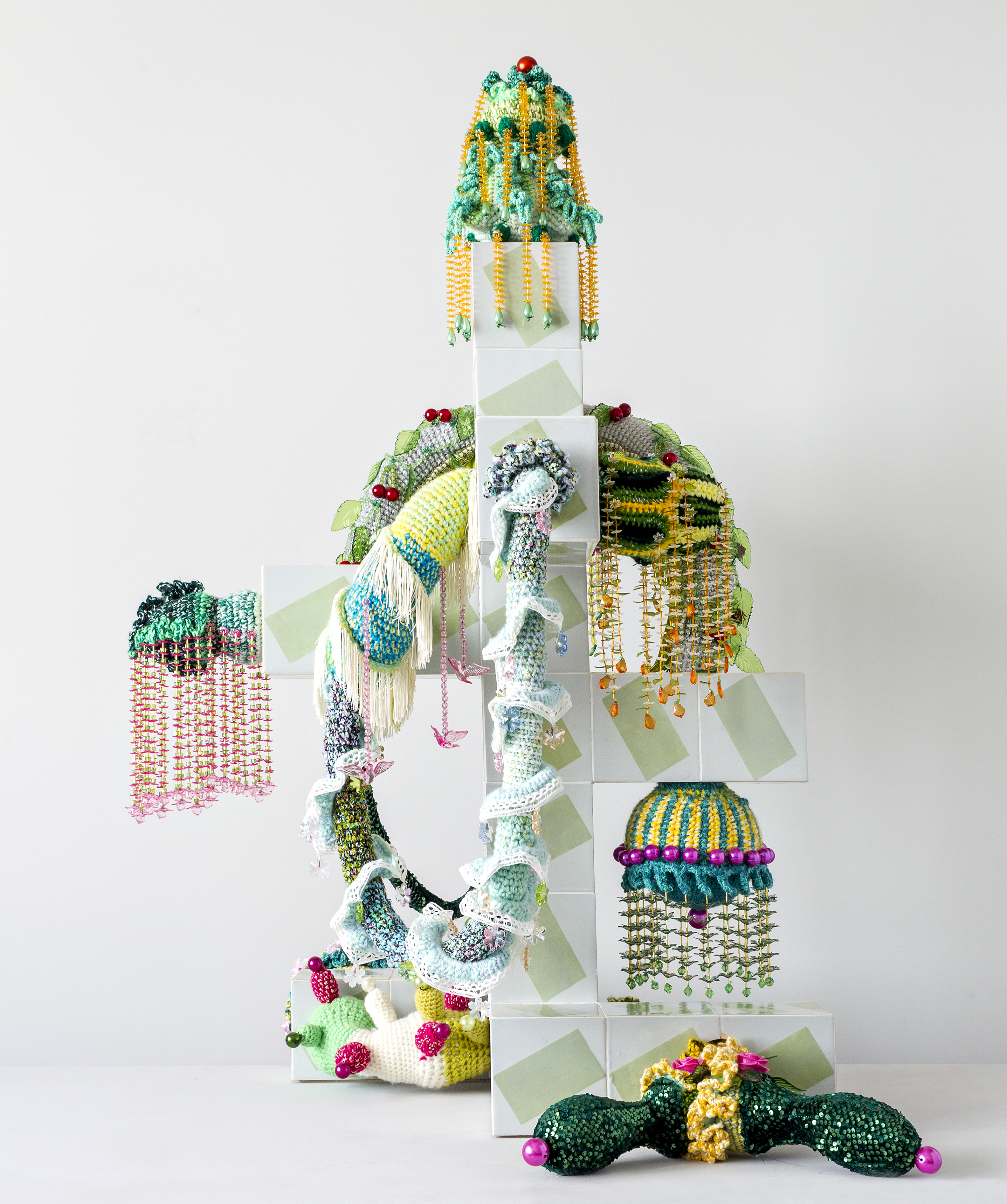 Viúva Lamego hand painted tiles, handmade woollen crochet, ornaments, polyester, plywood, iron