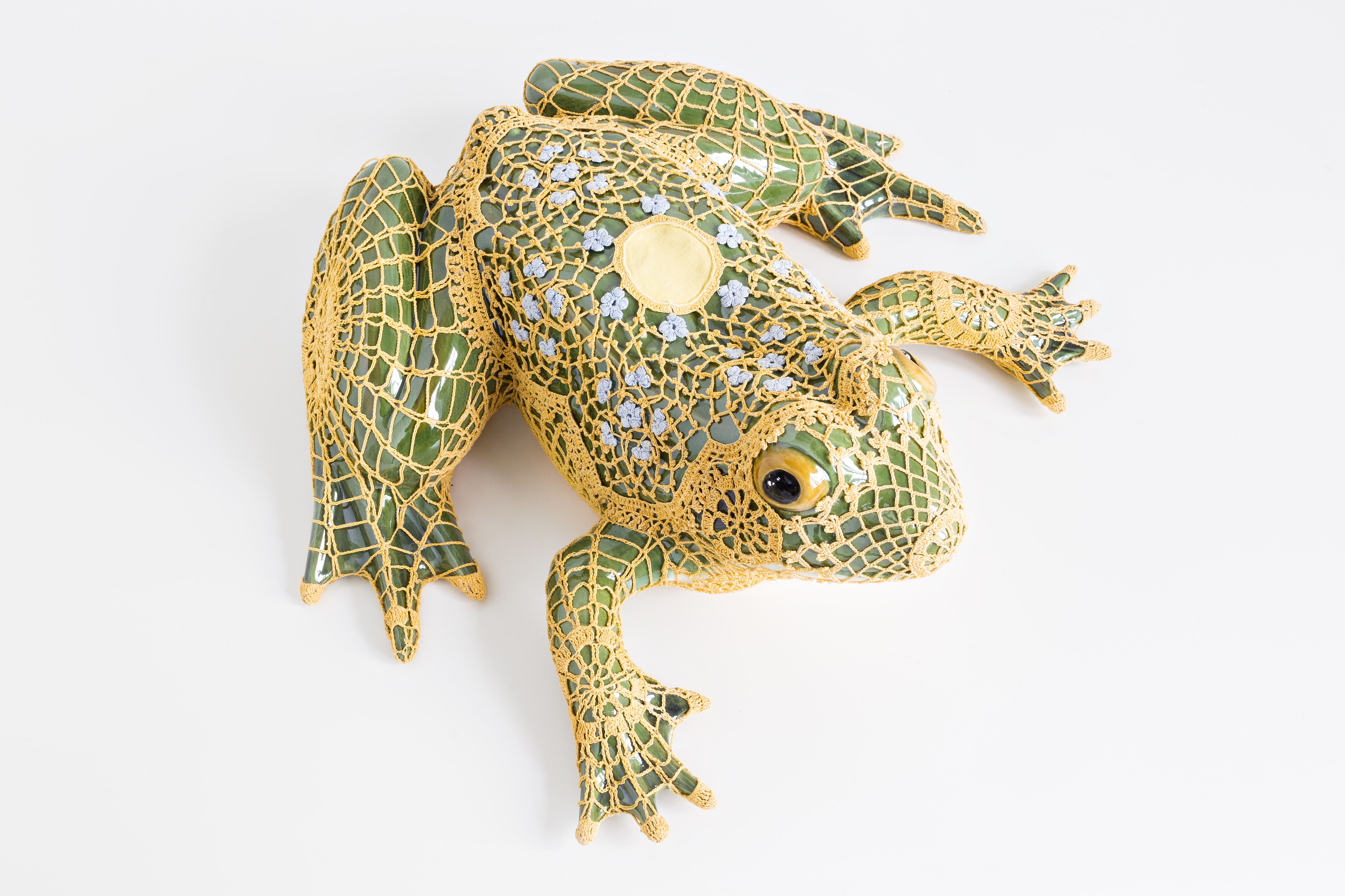 Rafael Bordalo Pinheiro faience painted with ceramic glaze, handmade cotton crochet