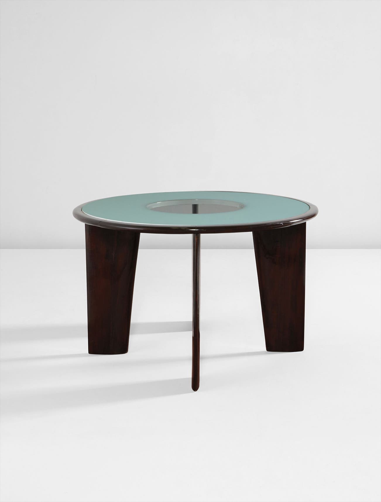 Brazilian rosewood, partially reverse-painted glass, painted wood.