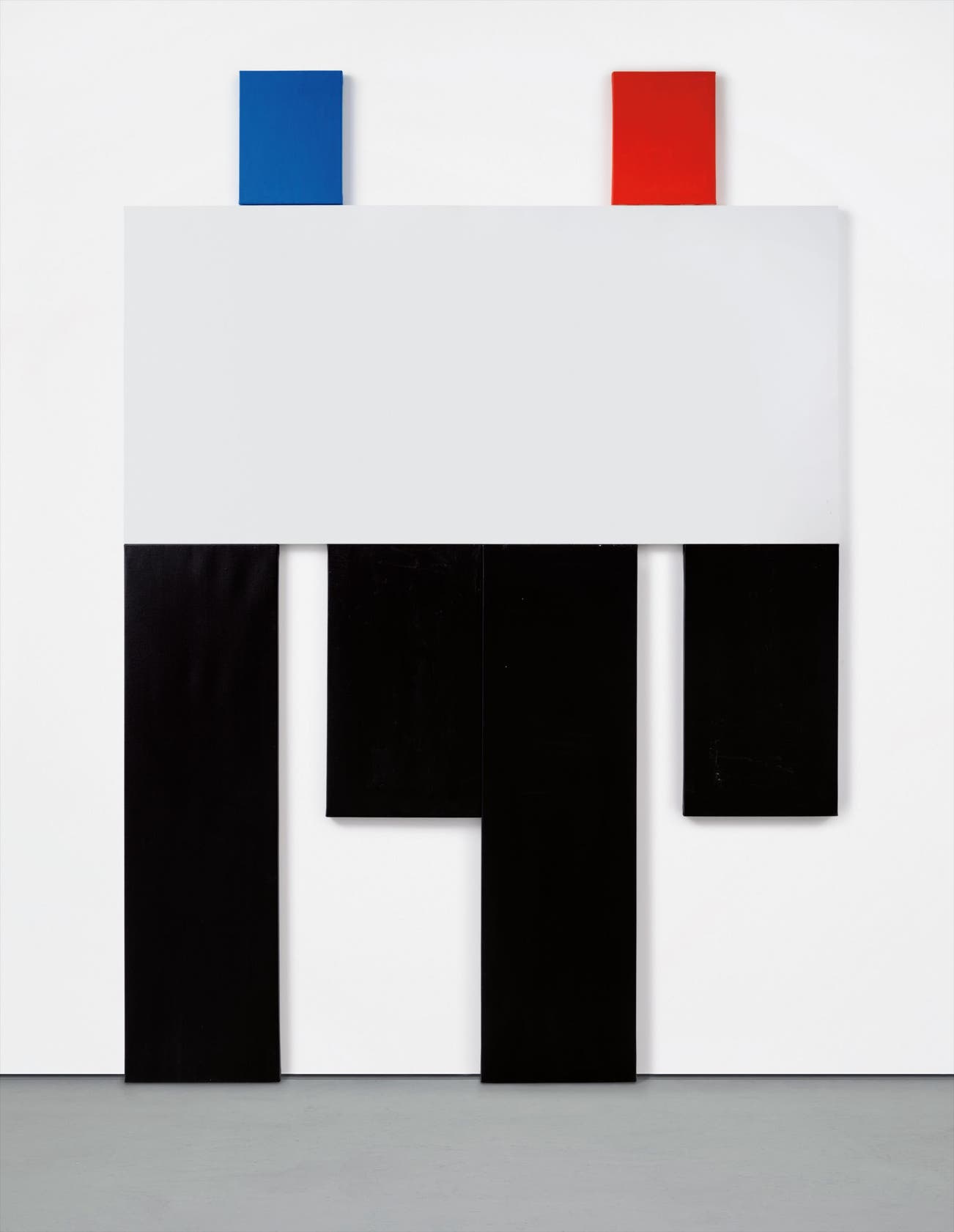 The meteoric rise of Bradley has seen an enormous range of painterly techniques pop up what feels like overnight—from his highly geometric, assemblage robot men such as the present lot, to his silhouetted figures against empty backgrounds to, most recently, his primal abstract figures on raw canvases; the true consistency in his work is the impetus of his unique mind. The monochromatic canvases that hang into the shapes of primordial figures certainly allude to Minimalism, yet their ambiguous and amorphous forms intrigue a range of interpretations. Of these vast and seemingly unending associations, Bradley has commented, “The video game reference was completely unwanted by me, just a strange by-product. And although that body of work was definitely informed by Minimalism, as I started to get some feedback on it, I realized what people were focusing on” (D. Blair and J. Bradley, “Artists in Conversation, BOMB Magazine, 2009). The incredibly static and unchanging nature of the monolithic figures in Police Painting 2 seems to exude a peculiar stuttering, almost as if the work cannot quite speak its message. This implicit nihilism, a relic of the anxieties emerging from the New York school, the work seems only to hint at little more than its own existence. Neither process nor formalist art, the present lot produces its own dialect, providing us with phantom of symbology without any lexicon with which to decipher the glyphs.
