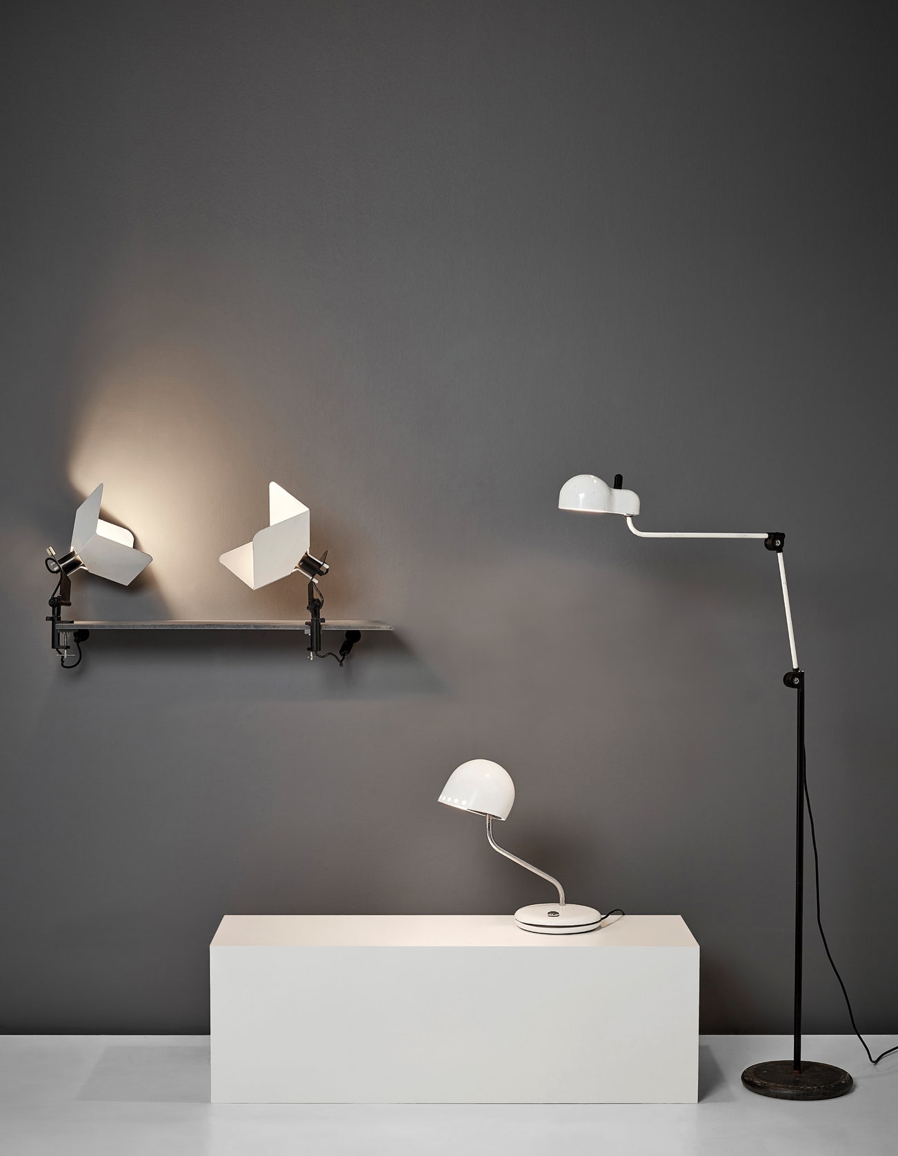 Pair of 'Triedro' clamp lamps, 'Topo' standard lamp, and 'Elmo' desk lamp