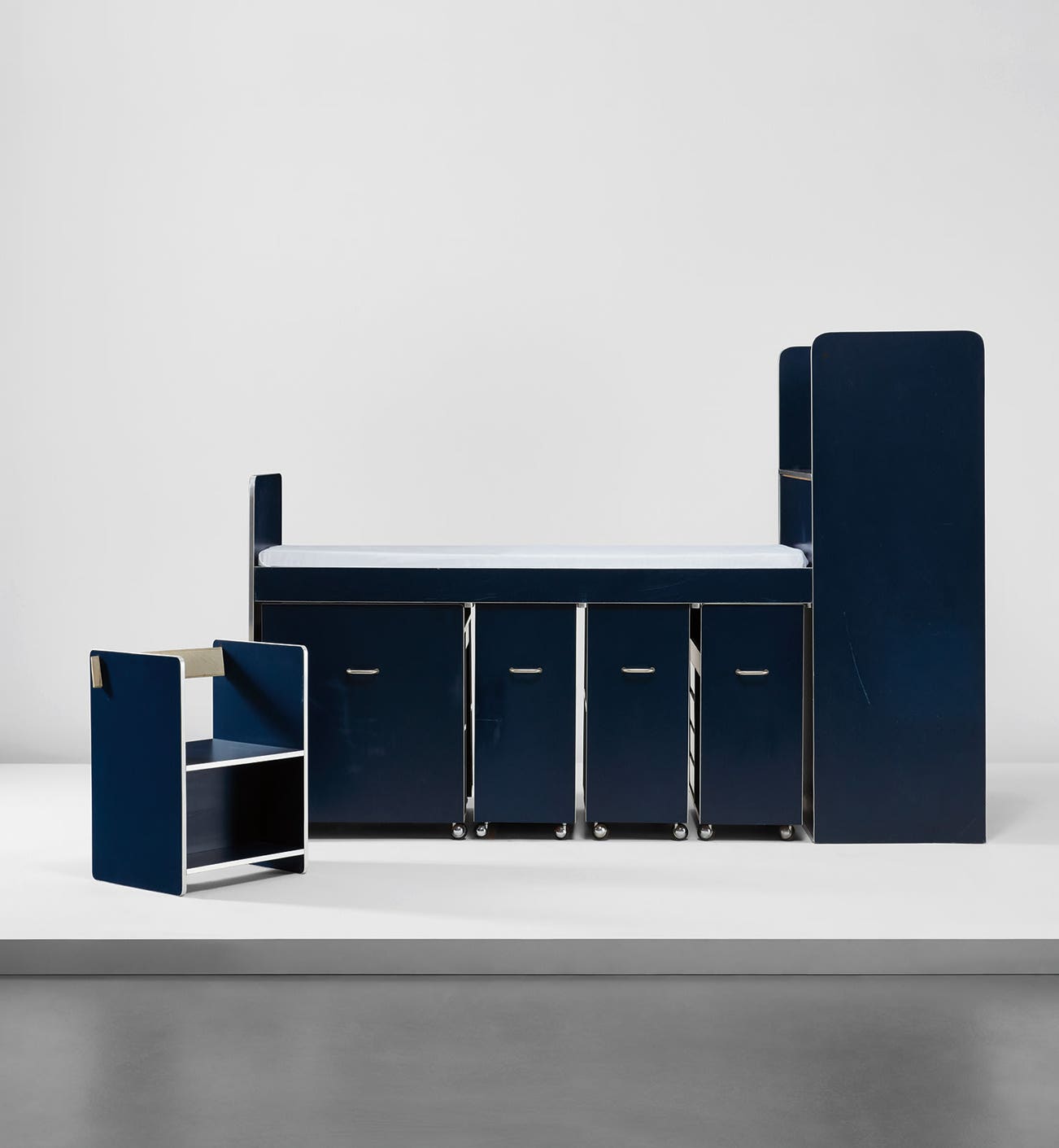 The present model lot, which was exhibited at the 1968 Salone del Mobile in Milan, includes a bed, wardrobe, bedside table, desk, bookcase, chest of drawers, shelves, and armchair (that also functions as a ladder when inverted). The piece was marketed as a space for nearly every quotidian activity: sleeping, studying, getting dressed, and relaxing. All of the component pieces could be separated from the overall “Box,” allowing the user to create myriad arrangements within his or her space. As the name suggests, the pieces were designed to be a synthesis of everything that a person needs to live.