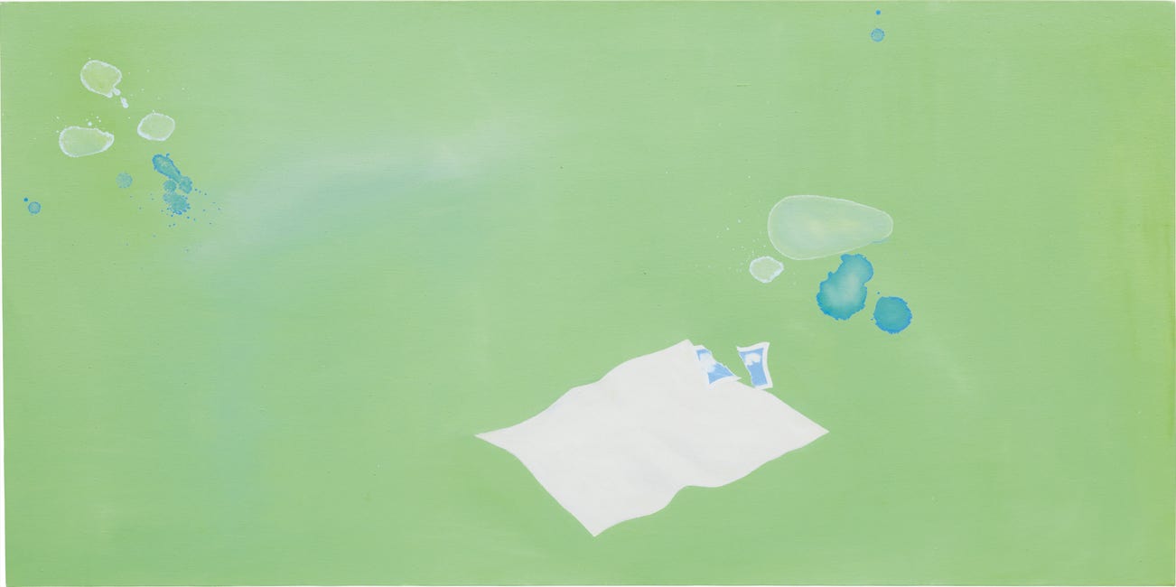 For the past five decades, Joe Goode’s paintings have blended both abstraction and figuration, referencing both natural and manmade domains. The present lot titled Clouds belongs to a series painted in the late 1960s to early 1970s, which probed the boundaries of reality and illusion. Against a green background, Goode has painted a rumpled white sheet, a torn Polaroid cloud study photograph, and illusionistic stains of blue and white liquid. While the three-dimensionality of the background is subverted by the illusionistic surface stains, the torn Polaroid contrasts photographic and painted representation. These dichotomies bring to question whether the stains are the result of the artist’s work on the sheet and the Polaroid, or whether this is just one component in the larger play of visual presence and illusion. As such, Goode’s use of the trompe l’oeil effect forces viewers to question their initial perceptions. He furthers this complication by choosing to house the work in a Plexiglas box frame, deliberately introducing the viewer’s reflection into the viewing experience of the work. Demonstrating his fascination with surfaces, Goode states that his choice of Plexiglas was not intended just to protect the painting, but to include a reflection of the viewer in the painting as well.