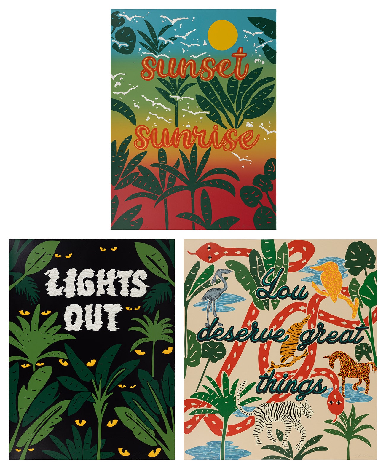 Untitled (Sunset Sunrise); Untitled (Lights Out); and Untitled (You Deserve Great Things)