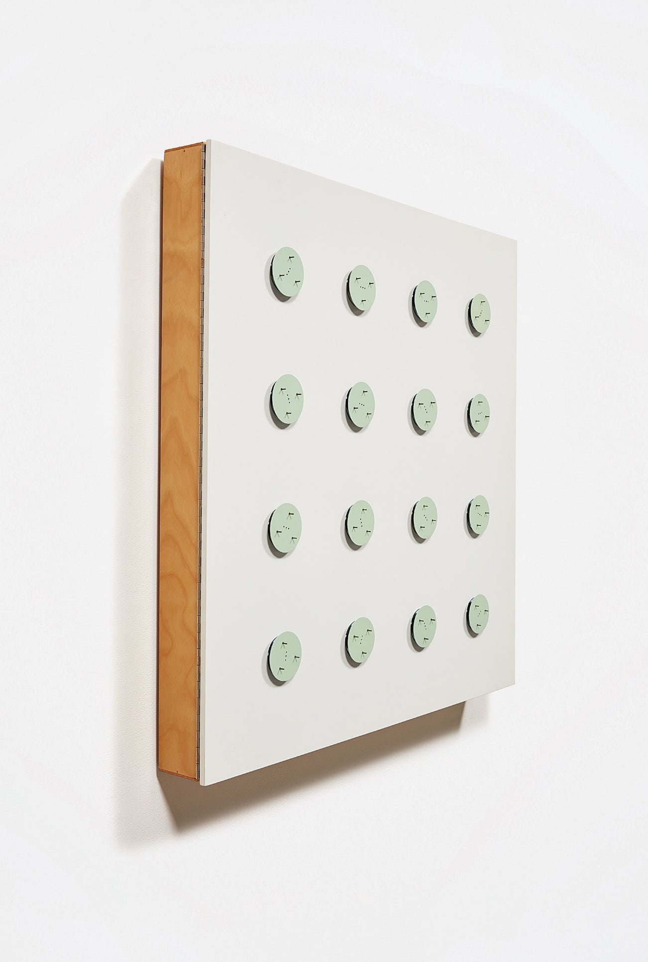 Wood, acrylic and 16 eighteen-note Reuge music box mechanisms, incised with song titles on the reverse, to be played.