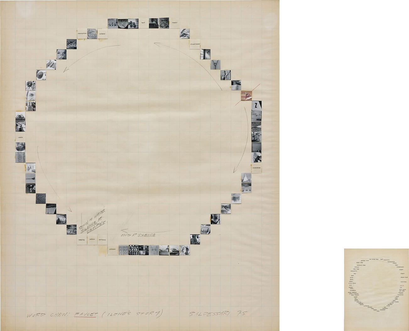 signed, titled and dated 'WORD CHAIN: FAUCET (ILENE'S STORY) BALDESSARI 75' lower edge of the larger part