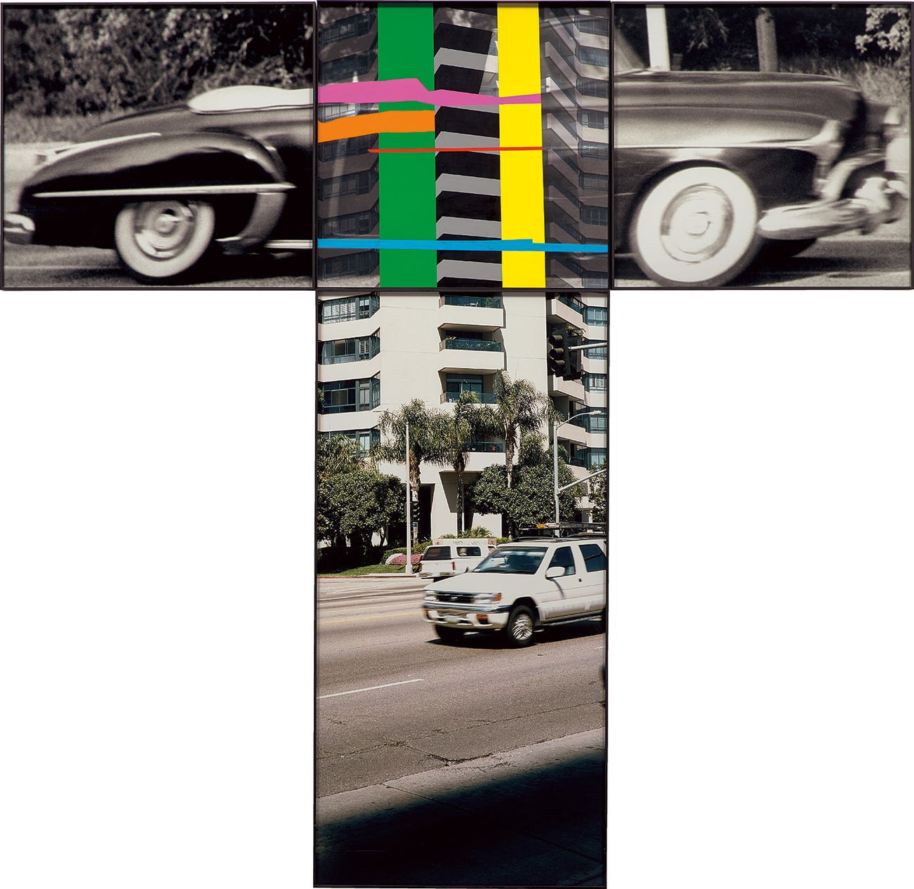 With Intersection Series: Automobile / High Rise Building, Baldessari expands on many of the core themes with which he launched his conceptual art practice. It was in the late 1960s that he turned away from painting – famously disavowing all work he had made between 1953 and 1966 in his Cremation project in 1970 – and instead explored a more open-ended approach to art-making that turned to photography as the main medium of expression and communication. The present work echoes Baldessari’s late 1960s National City series, which consisted of grainy images depicting the automotive landscape of his Southern California hometown. As Baldessari recalled, ‘I would drive around National City where I was living and randomly shoot out of the window with the camera without even looking and drive with the other hand’ (John Baldessari, quoted in Moira Roth, ‘Interview with John Baldessari’, 1973, X-TRA, Winter 2005, vol. 8, no. 2, online). The present work belongs to the sub-group of T-shaped works in the Intersection series that feature photographs Baldessari took along Wilshire Boulevard, the principal East-West road connecting Downtown Los Angeles to the ocean.