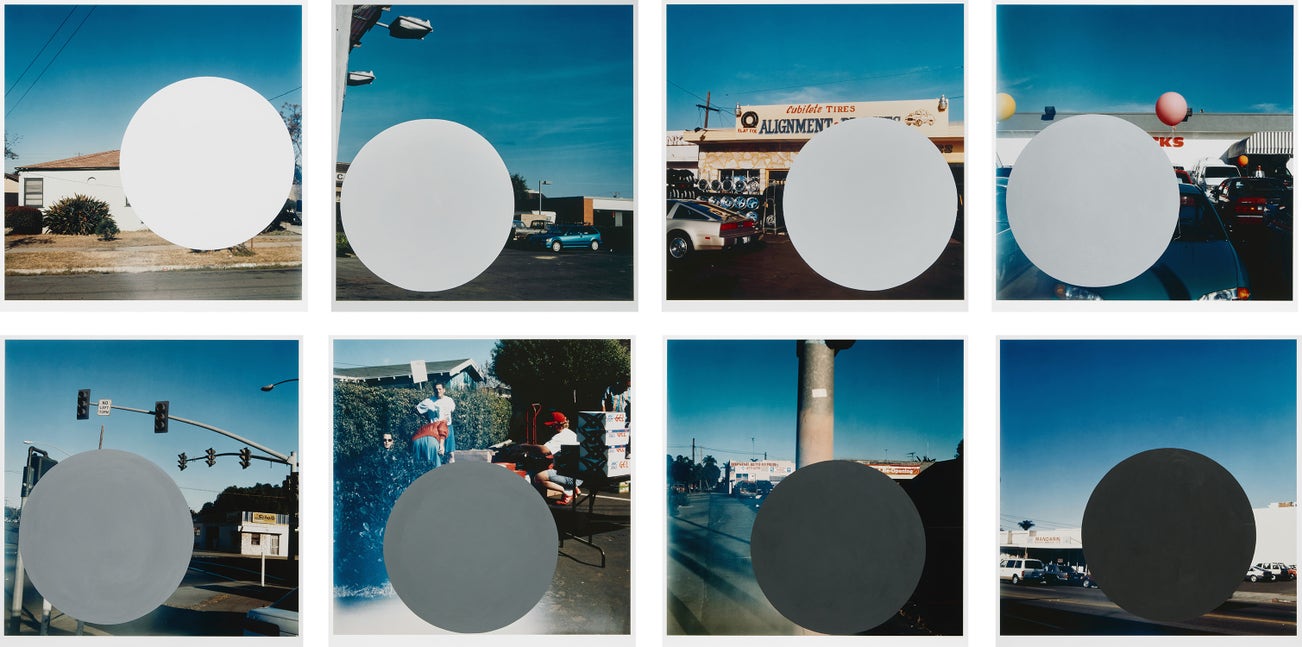 'This portfolio consists of eight color photographs with hand-painted, acrylic additions published by Patrick Painter Editions. The photographs are snapshots of familiar routes taken by the artist in his hometown of National City, just south of San Diego. Baldessari applied paint directly to the photos to remove what he saw as flaws. As the title suggests, the prints should be installed in a horizontal row from the lightest (W=white) to the darkest (B=dark) circle, and numbered sequentially (1-6) in between the two letters.