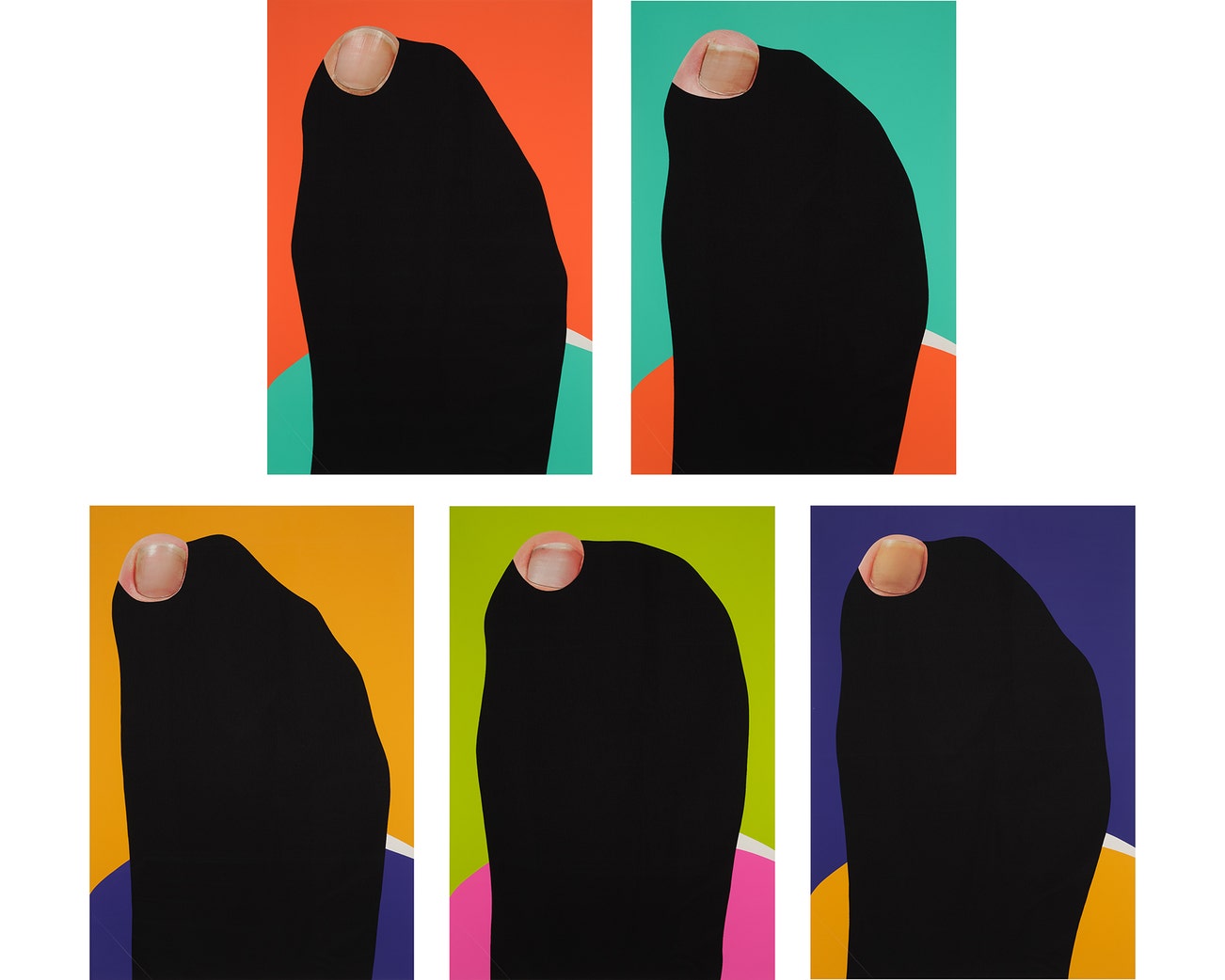 Five 8-color screenprints with fabric and paper collage, each mounted and mounted again.