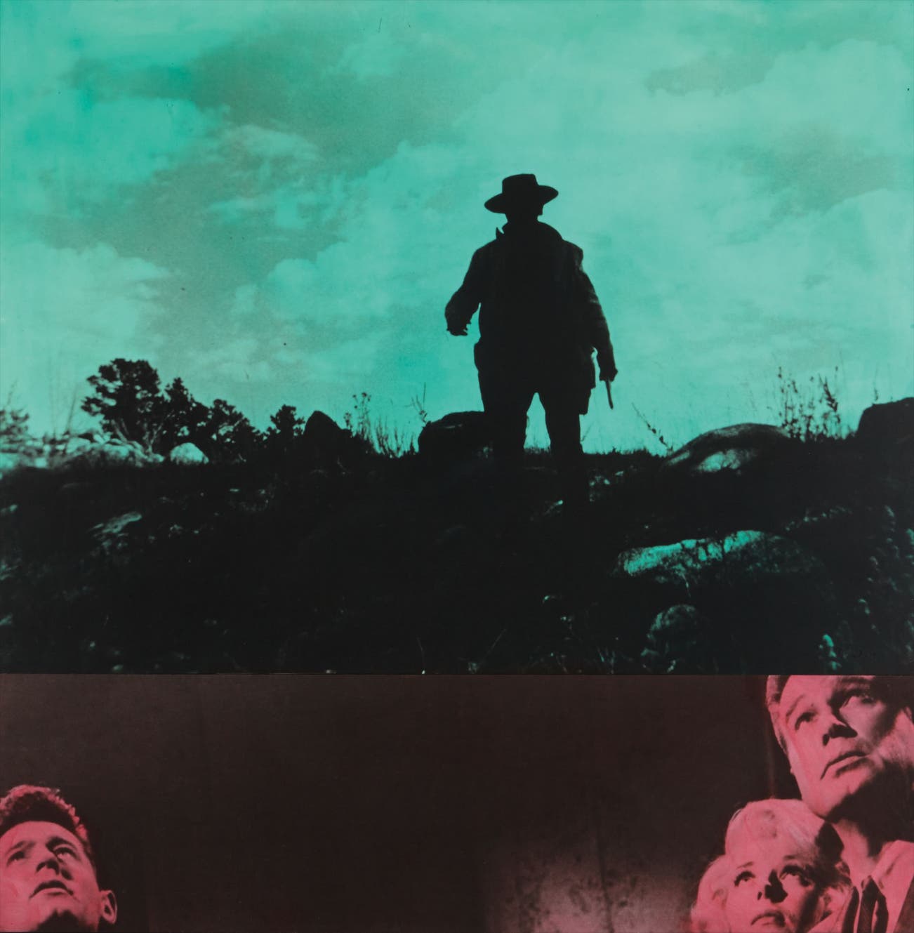 The artist’s California origin appears to have informed his work, such as Green Sunset (with Trouble), especially in its Hollywood-inspired Hitchcockian essence. The silhouette of a cowboy hovers above a horizon. He is at once a symbol of All-Americanism, the same timeless and ubiquitous emblem of soil-of-the-earth masculinity that has been populating the American cultural subconscious since the early days of cinema. However, his benign heroism appears to be potentially undermined by its juxtaposing against the image below it. A group of individuals look up in consternation. Assumptions about the cowboy’s benevolence are subsequently subverted. Viewers are automatically led to extrapolate a potential dialogue and meaning behind the two corresponding images. Could the trusted American symbol of protection, in fact, be of a villainous nature? Are the people below in danger? Alternately, do they want to harm the cowboy? The coloring of each image in opposite colors highlights the conflicting tension between the two as well as the artificial and constructed nature of the scene. A prolonged studying of the work continues to encourage the viewers to construct an underlying unifying plotline—a likely turn of events and potential twists in narrative that could envelope the characters on hand. And yet, the longer viewers continue their engrossment in this imagined narrative, the more Baldessari appears to remove his presence from the artwork, allowing the viewers to exist in a space that sits between fiction and reality, between art and photography.