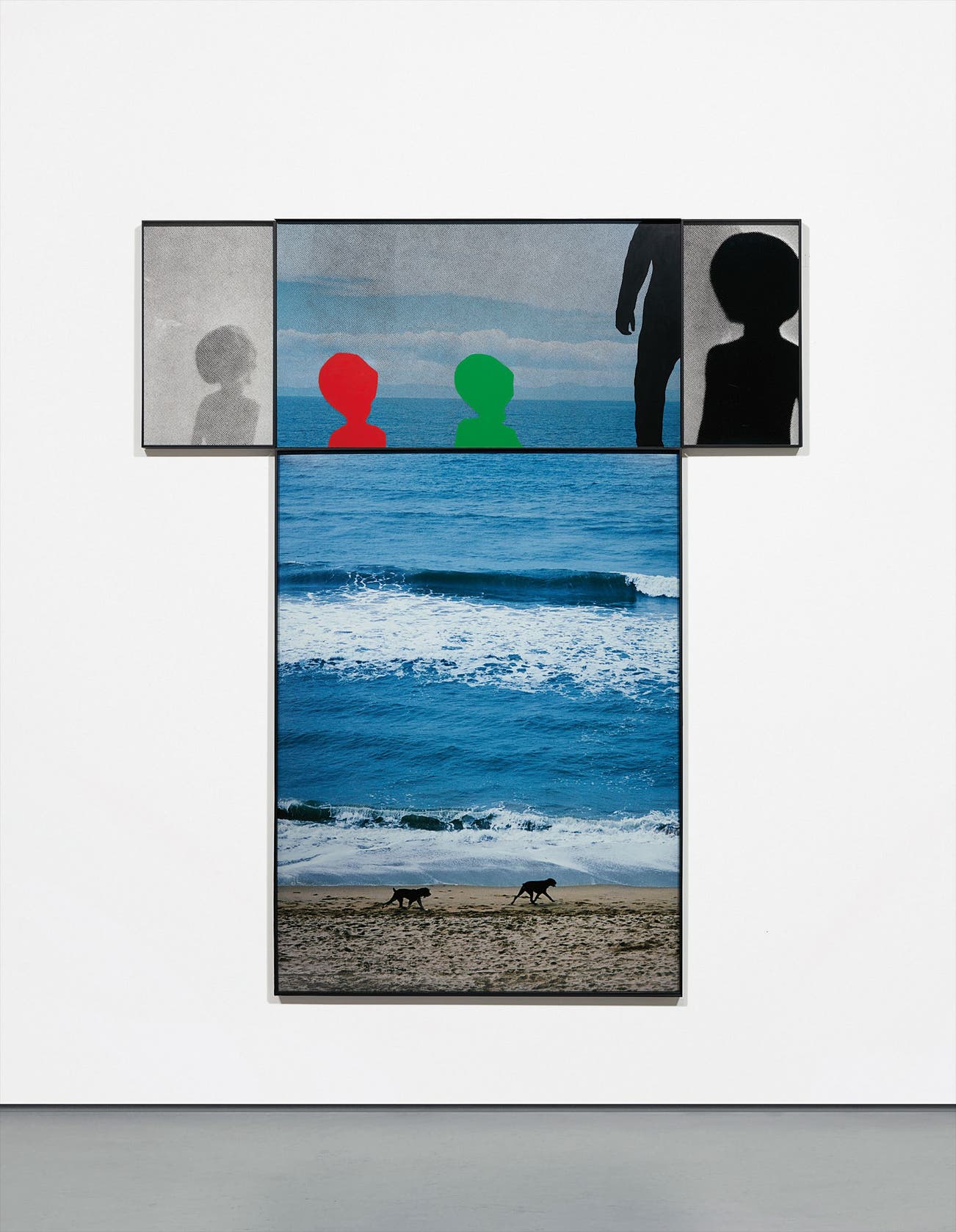 Constantly striving to find new ways of merging photography and painting, Two Dogs and Two Aliens (2002) is a striking example of Baldessari’s artistic preoccupations. Painting in bright colours on top of a photograph of a seascape with two dogs, Baldessari unites the two mediums. However, the flat voids of colour seem abruptly jarring as they only appear in the top third of the vertical work that then extends and divides into three further sections. Creating parallels through the framing method used in this work, with the pieces from his Intersection Series, Baldessari similarly juxtaposes two disparate concepts that are outlined in the title: the seascape and aliens. Perhaps influenced by the release of the popular film Signs that same year, or the public’s consistent fascination with intergalactic beings in movies in general, Baldessari creates a shadowlike silhouette, sections of which are scattered in the top band of the composition. The recognisably enlarged heads hark back to the cinematic representations of these extra terrestrial beings whose appearances have been the subject of much variation.
