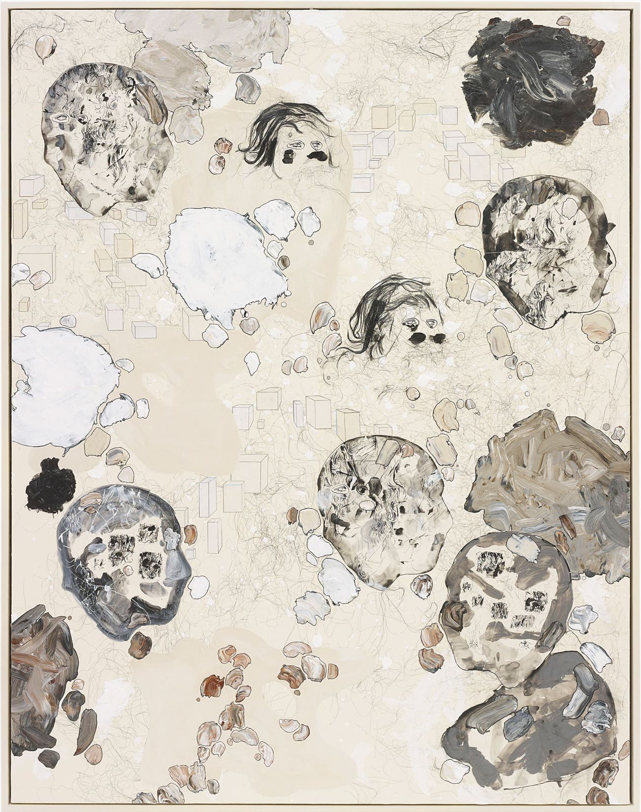 acrylic, paper, synthetic hair and gel medium on canvas