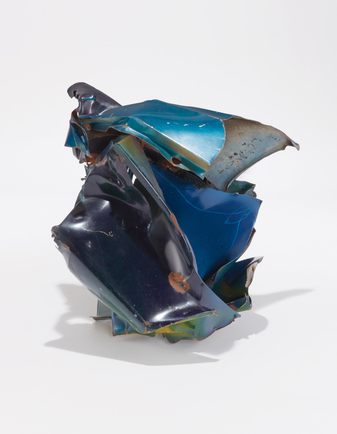 Rendered in various shades of hi-fi blue, Untitled from 1963, stands as a stunning example of John Chamberlain’s signature process of crunching and torqueing discarded automobile parts into elegant and harmoniously balanced sculptures. Improvisation was essential to Chamberlain's implementation of automobile parts as his preferred sculptural medium. In 1957, while visiting his artist friend Larry Rivers, Chamberlain ran out of art supplies, so he spontaneously removed the fenders from Rivers' old Ford and ran over them with his car, reshaping the debris into sculptural elements. Chamberlain described himself as “basically a collagist. I put one thing together with another thing. I sort of invented my own art supplies.” (John Chamberlain quoted in Susan Davidson,John Chamberlain: Choices, New York, 2012, p. 27)