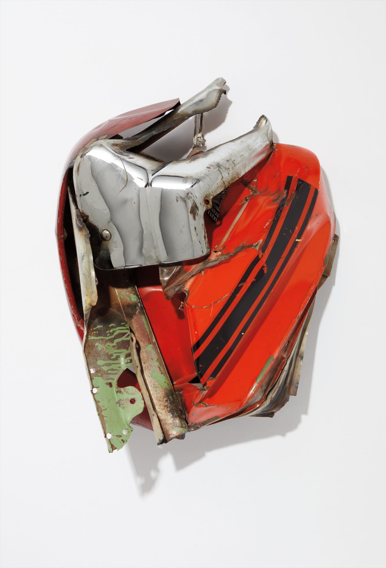 Wall-bound in three dimensions, Lucy Snaggletooth pulsates with Chamberlain’s particular creative sensibilities. Melding the expressive use of color found in the work of his Abstract Expressionists predecessors with the Americana-Pop inflection of the found car parts, Lucy Snaggletooth is a luscious example of Chamberlain’s wall-relief works. Chamberlain described himself as “basically a collagist. I put one thing together with another thing. I sort of invented my own art supplies.” (John Chamberlain, quoted in Susan Davidson, John Chamberlain: Choices, New York, 2012, p. 27) A vibrant orthogonal of vermilion serves as the foundation for the piece, flanked by a deep crimson on the left and wonderfully cut through with the black racing stripes of the original Chevy Corvette Stingray (as seen in the hood ornament subtly embedded within the composition), while a cliffhanger of polished chrome leans out and over the top edge. The beauty of the work is grounded in its compositional elements, so clearly evocative of their prior lives as car parts, now imbued with new creative powers. Lucy Snaggletooth brims with Chamberlain’s unbridled energies; bound to a wall, the present lot commands the room in which it is installed.