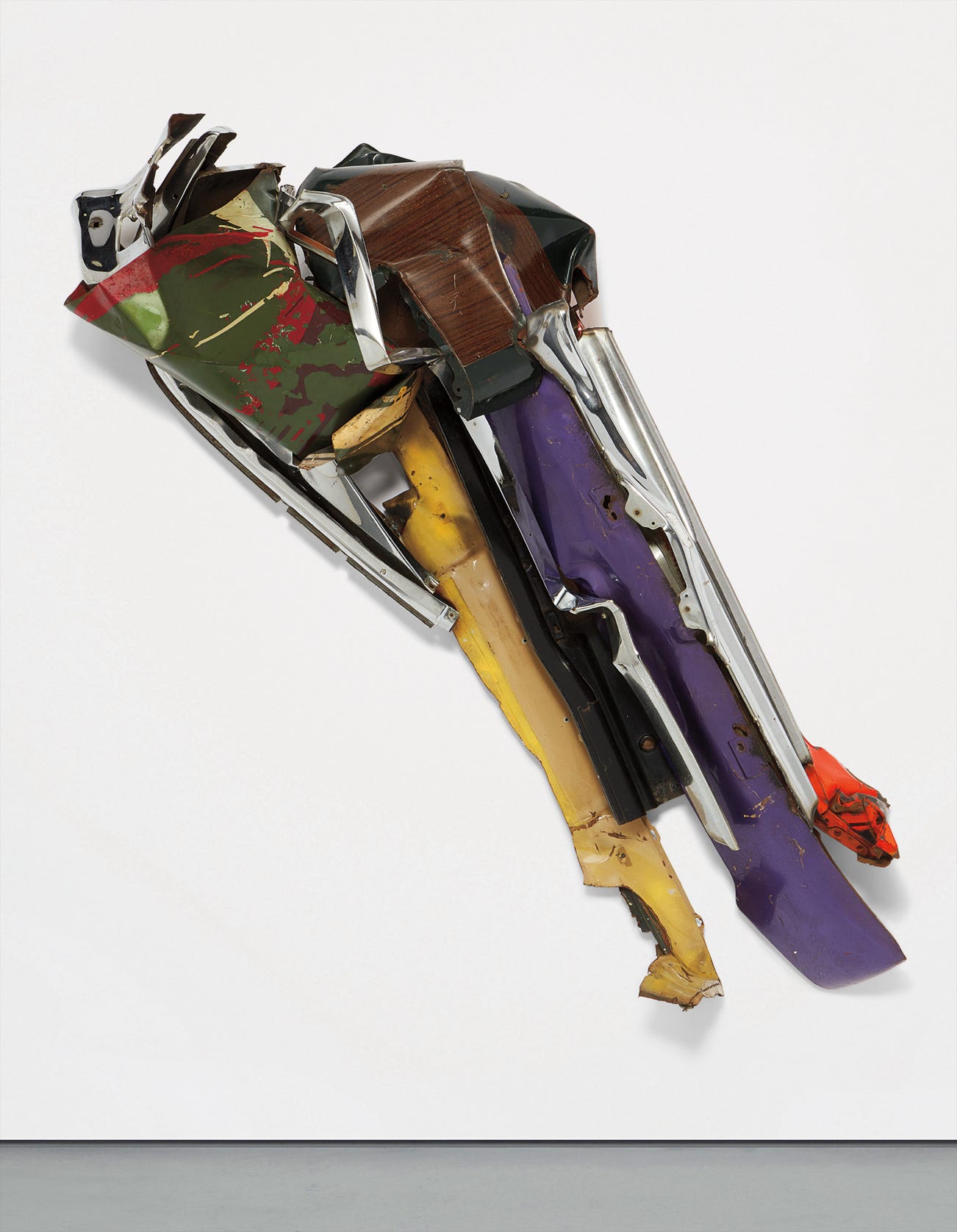 Executed at the height of his career in 1975, John Chamberlain’s large-scale, wall-bound sculpture Chamooda is a stellar example of the artist’s signature practice. By 1971, the year of his first retrospective at the Solomon R. Guggenheim Museum, Chamberlain had already established himself as the foremost contemporary sculptor of the era. Following an exploratory period in his career beginning in 1965 when the artist began utilizing different materials including found objects, steel boxes, Plexiglas and foil, Chamberlain returned to car parts in the early 1970s, this time more selective in his use of specific elements including bumpers, hoods, roofs and the chassis. The sculptures from this decade were characterized by a more ambitious use of color, achieved by both scraping away existing pigments on the car parts and also adding new hues with active, abstract brushstrokes. In the present lot, a green car part in the upper left is splattered with fiery red paint, while the diagonal lower elements of the work are solid yellow and purple. Extending from the upper left through the central axis of the form, Chamberlain has left the chrome surface of the chassis alone, which in turn reflects the colors of the adjacent elements. The resulting form is a vibrant relief sculpture, projecting into space from the wall on which it is hung.