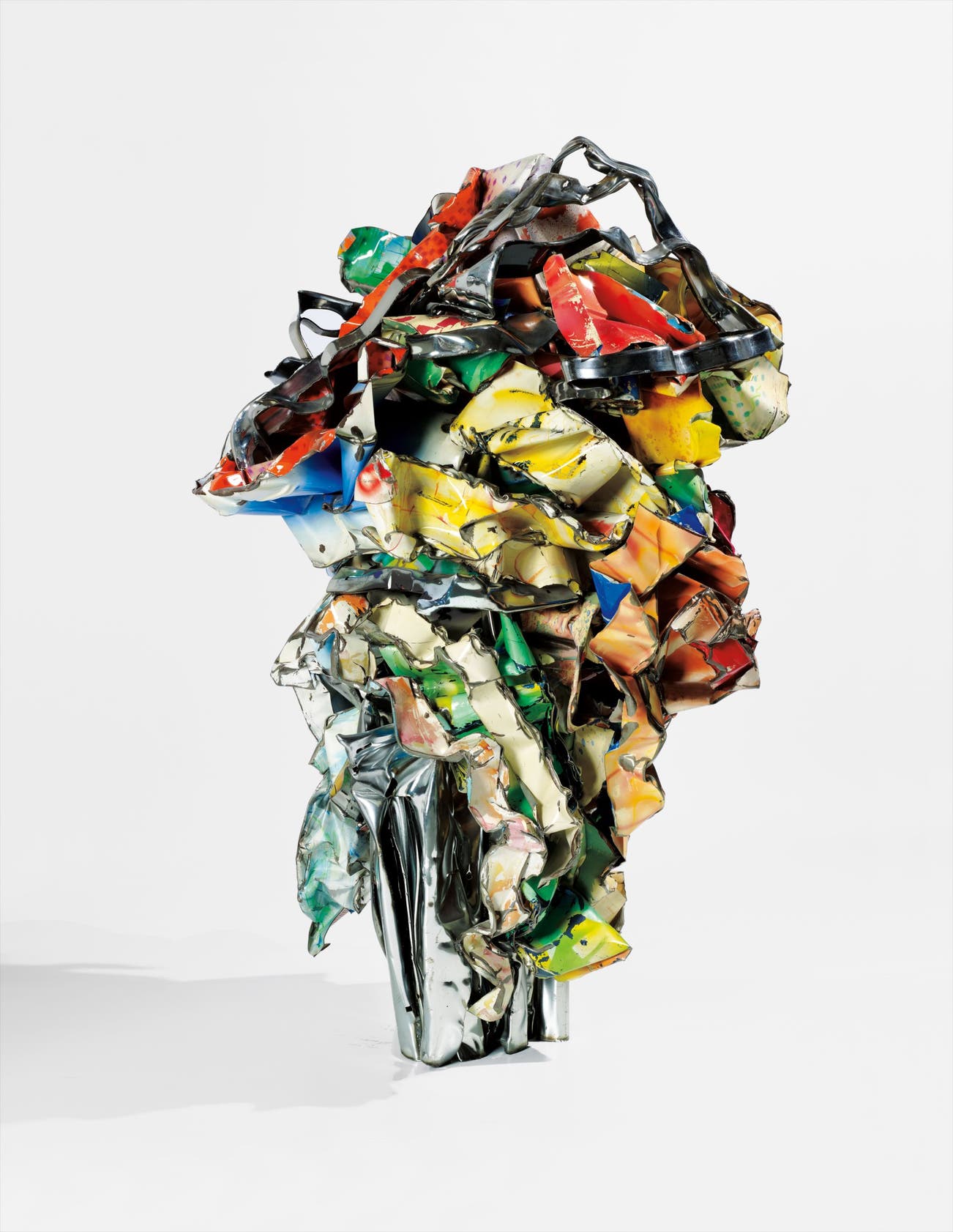 In his appropriation of such “waste material” and everyday media, Chamberlain too drew upon his Pop Art peers, reclaiming unused and unwanted car parts in an era that saw America’s industrialism largely exemplified by Detroit’s car industry. Transforming the mundane into the sublime, Chamberlain’s unintended commentary on the malleability of his chosen media – both in material and in concept – references the appropriation of the imagery of mid-century America’s popular culture by Robert Rauschenberg, James Rosenquist, and Andy Warhol. Revealing his concern with the reinterpretation of the quotidian, Chamberlain once described his sourcing process: “I wasn’t interested in the car parts per se. I was interested in either the color or the shape or the amount. I didn’t want wheels, upholstery, glass… none of that. Just the sheet metal. It already had a coat of paint on it, and some of it was formed… I believe that common materials are the best materials.”