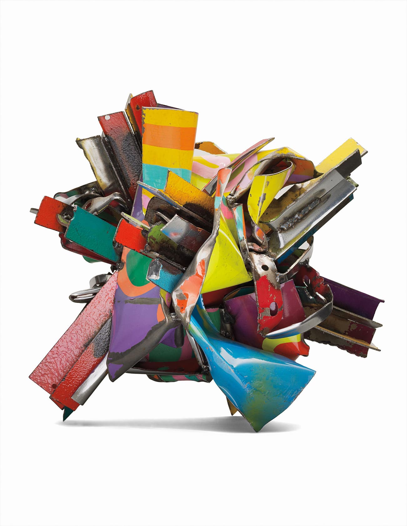 Leggsbenedict from 2008 is a superb late work which rejoins many of his much earlier, smaller scale pieces. Formed of his trademark colored scrap metal, Leggsbenedict exudes a particular visual energy that is in fact a direct result of the work’s more moderate size. As with his acclaimed wall reliefs, Leggsbenedict compresses an incredible amount of visual energy within a seemingly compact amount of space. With its various armatures, hues, and angles of approach, the work has an incredible presence of being that is only found in the exemplars of Chamberlain’s oeuvre.