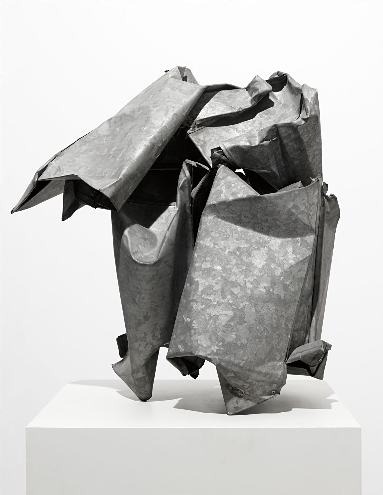 “The Galvanized sculptures began with fabricated boxes; they were something like forty-two inches high, eighteen inches deep, maybe twenty-eight inches wide. They had the same proportions as the cigarette packs I'd been crushing when I sat around in bars, drinking a lot and making sculpture out of cigarette packs as we emptied them." John Chamberlain, 1980sAmerican sculptor John Chamberlain is credited with transporting Abstract Expressionism into the third dimension. A notorious figure from the moment he entered the New York art scene in the late 1950s, Chamberlain undertook a tireless pursuit of materiality and form through a distinctly intuitive process. The story of how Chamberlain created his first sculpture is legend: while staying with friend and fellow artist Larry Rivers in 1957, Chamberlain discovered an old Ford truck rusting on the property. Inspired, he tore off the fenders and proceeded to drive over them with his car to shape and form the metal pieces into the shape he wanted before fitting them together to create Shortstop. It is this idea of "fit" that continued to be a guiding principle in Chamberlain’s work. Based on the implied relationship between size and scale, fit for Chamberlain is the sculptural equivalent of collage or assemblage on a monumental scale. Throughout his career, Chamberlain insisted that the materials he worked with, most famously car parts, was out of the abundance of availability and the cheapness at which they could be acquired. However, despite the convenience of these materials, each piece of "junk" was carefully chosen by Chamberlain via a process of active selection. By recontextualizing these materials as art, Chamberlain gave them new meaning. However, he continuously rejected any metaphorical connotations that could be derived from automobile associations; he maintained they were strictly an extension of Expressionism. Often using brightly colored sections of cars this readymade material, as it were, allowed Chamberlain to challenge traditional sculptural, as well as painterly, boundaries and essentially fuse, or rather fit, them together. Chamberlain has been associated with Expressionism, Pop Art and Minimalism; however, throughout his lifetime he upheld his position firmly as an abstract artist. While his fluid forms appear to be created through incident, Chamberlains works are the outcome of a combination of intellect and intent and retain a sense of control which is evident in the thoughtfully welded elements that transform each work into a highly sophisticated collage-like composition. Chamberlain’s crowning artistic achievement was the ease through which he appeared to deform hard metal as if it were merely crumpled paper. Each of Chamberlain’s works convey elegance and emotion. They are not about the magnitude or might of the material but about the balanced scale and volume that creates their spatial mass. The present lot is an example of a rare series of sculptures made of galvanized steel that were only produced between 1967 and 1969. Weary of the criticism that was plaguing his signature car part works that situated them as a commentary on American car culture, consumerism and taste, Chamberlain sought out other materials through which he could create sculptures so as to avoid then so called "car crash syndrome." Galvanized steel, an industrialized metal that has been processed with a protective coat of zinc to prevent rusting, provided a history-less material absent of narrative. It is these works that most strongly connect Chamberlain to Minimalism, and although he embraced the austere material – a favorite of his close friend Donald Judd – these works retain the fluidity and sensuality of expressionism. Chamberlain’s galvanized steel works are the result of a process through which the artist crushed large steel boxes in a compressor. The idea behind these works was to crush the metal boxes in a process that would convey the same ease through which a cigarette carton could be crushed by hand, creating a natural form that was strictly the result of an action. Chamberlain insisted "whatever came out was what came out" and while they were not premeditated, the sculptural forms were a direct result of the actions that shaped them and represent a visual record of metamorphosis. An additional factor that contributes to the sense of sincere transformation in these works is that many of the boxes were originally created for Judd but had been slightly damaged and therefore did not fit with his structured aesthetic. By reclaiming and resituating these boxes, Chamberlain gave new life to a material that would have otherwise been discarded, in a similar vein as he did with the car parts.More than any other of his works, the galvanized steel pieces play with visual judgments of weight. These sculptures were created from fairly light sheets of metal and formed into hollow cubes. Once crushed, the volume and density increased as the metal folded onto itself, concentrating the energy rather than dispersing it. The simplicity of Chamberlain’s practice is thus the complex underpinnings that allowed him to endow an ascetic material with a highly emotional value. The sensuality of the folds transforms the hard lifeless metal into a work comprised of natural soft forms full of movement. Although he considered himself a colorist, these monochromatic works are a coherent extension of his practice because Chamberlain believed the galvanized pieces had "their own color." Above all, Chamberlain respected the inherent properties of the materials he used and embraced the absorbent, non-reflective surface of galvanized steel.