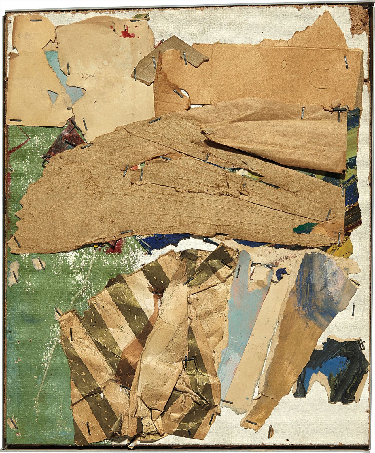printed paper, painted paper, cardboard, cellophane collage stapled on painted pressboard