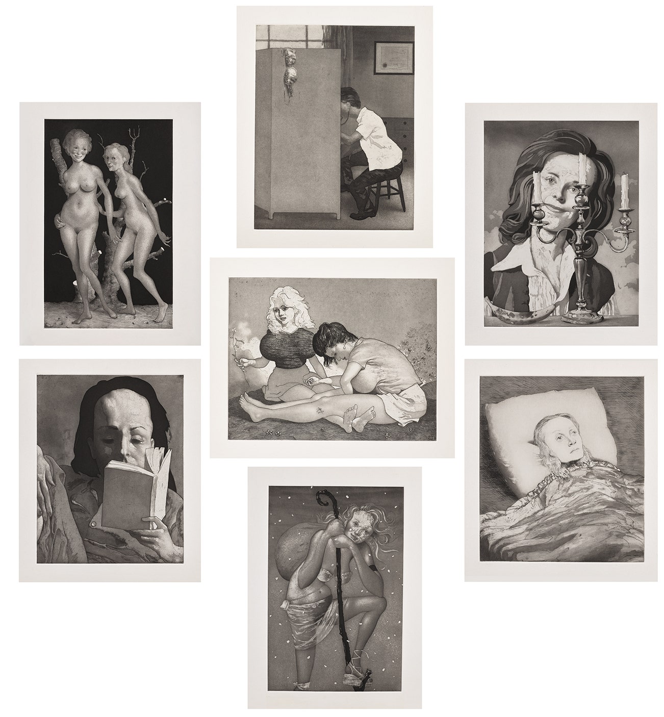 The complete set of seven etching, aquatint and drypoints, on Kochi NB paper, with full margins, with title page, colophon and the original brown leather portfolio.