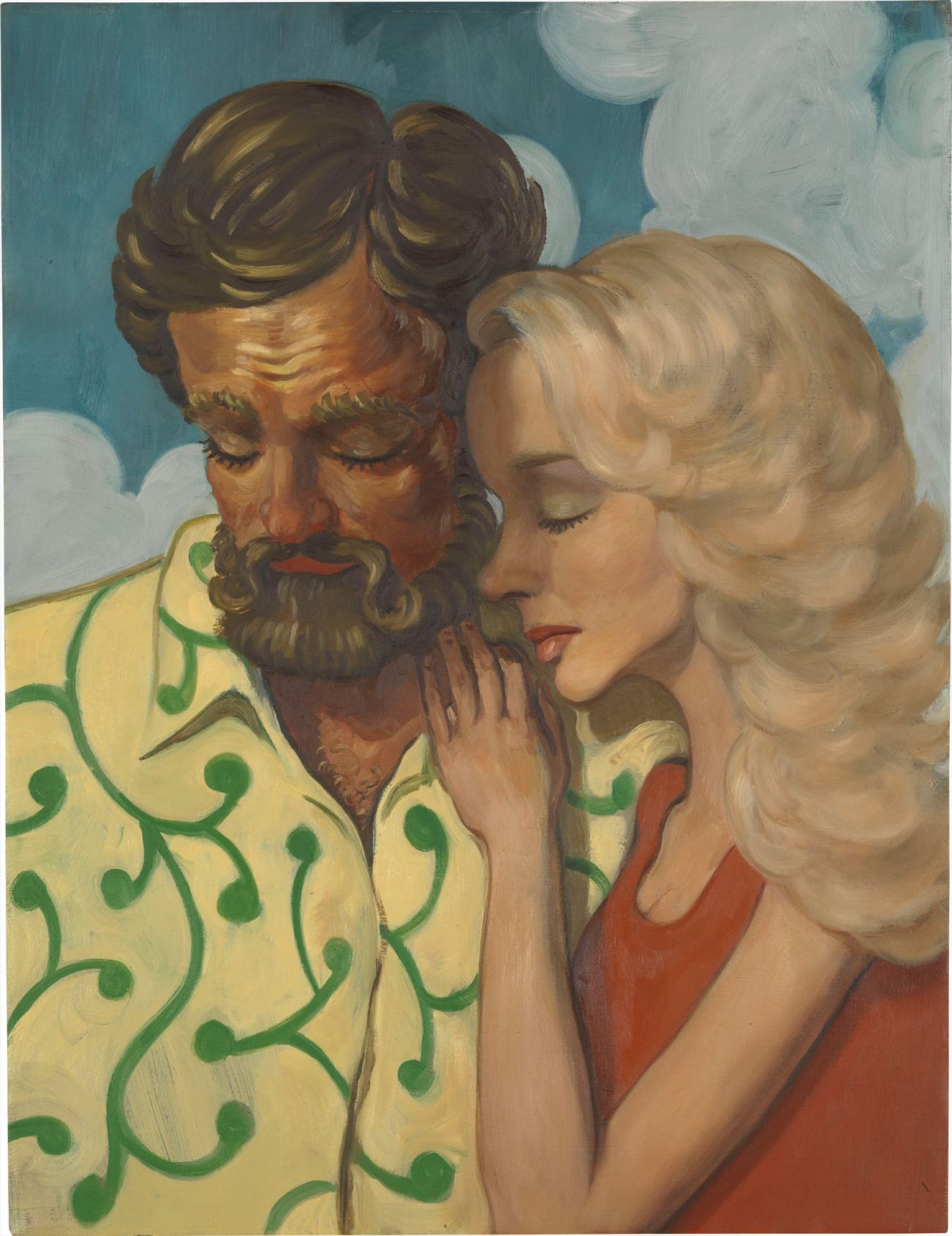 The Owens, 1994 is indeed a technical marvel. Ecstatically sprinkled in sunlight from the setting sun, the affectionate couple leans upon each other with a gentle touch—a pair immersed in surrender. Signs of virility and health—the deep golden hues of the man’s skin and the thick waves of his beard, the curve of the woman’s breast and her full red lips, are offset by their heavy eyelids and lowered heads. It is as if they are bowing to the sun itself, arbiter of all happy days in the Golden State. What’s more, the pale yellow of a wonderfully flamboyant shirt and the intense Matisse blue of the surrounding sky cannot lighten the weight of the sacred moment. As if to put an end to speculation as to whether the couple is simply enjoying a moment in the breeze, Currin’s paints a tiny flourish on the man’s cheek that one could mistake for a blemish had it not been painted in a tone light as the sky itself.