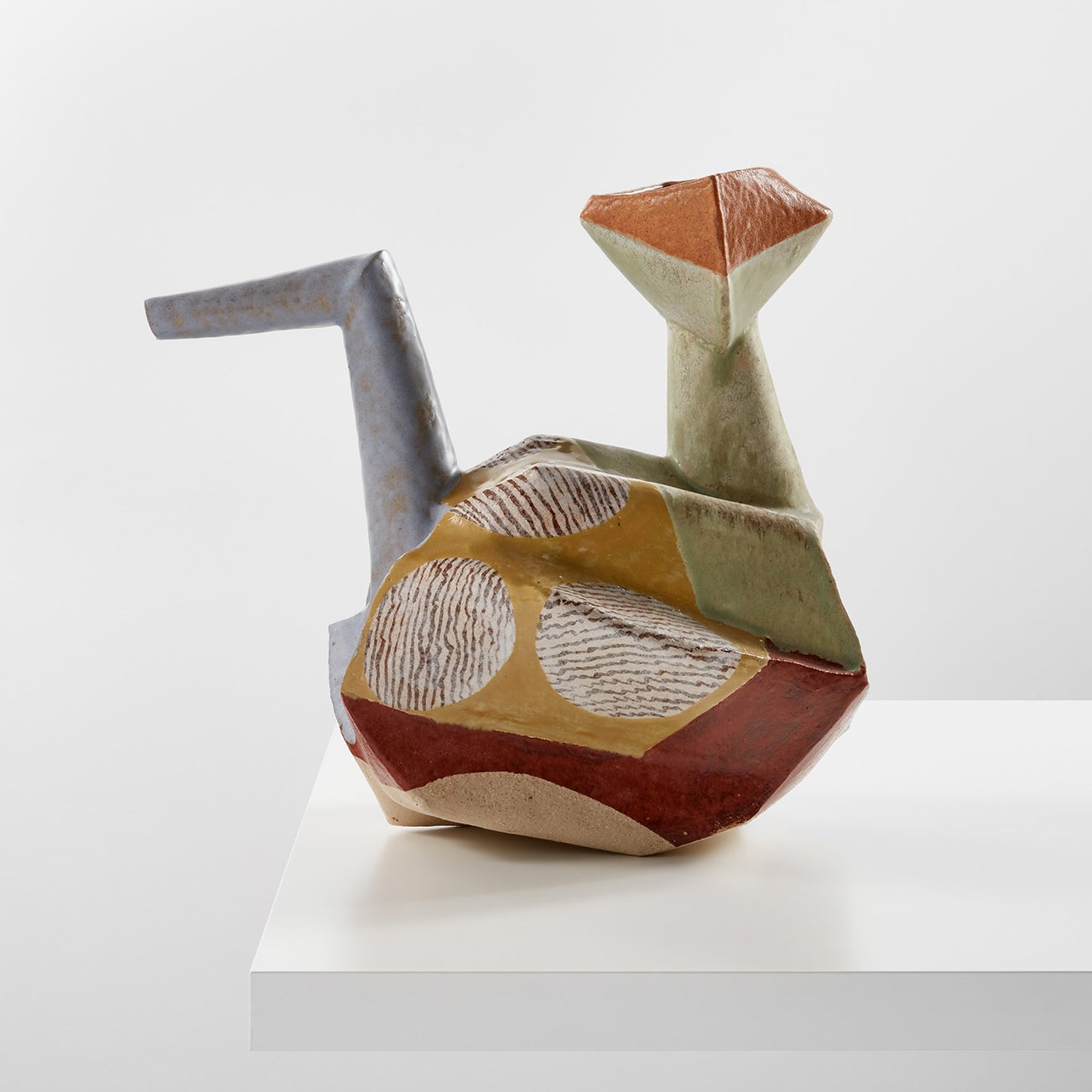 With reference points ranging from ancient Persian ewers to the abstract art of Arthur Dove and stack mills in Ohio, Gill’s penchant for playfully reinterpreting historical references lends a Postmodern sensibility to his work, as seen in the present ewer. Similar works are held in the permanent collections of museums including The Metropolitan Museum of Art, New York; the Los Angeles County Museum of Art, California; and the Victoria & Albert Museum, London, among others.