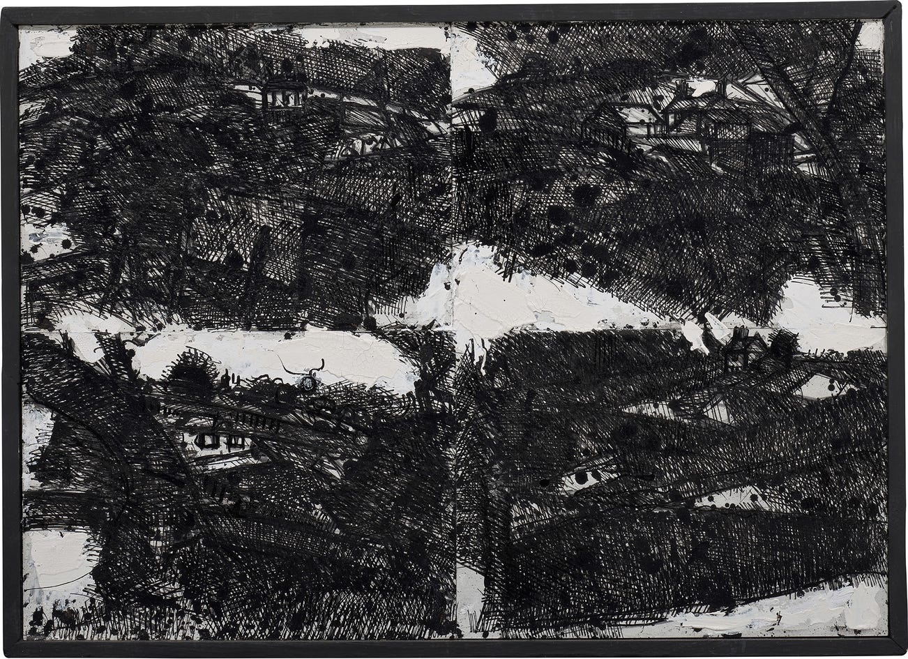 ink, pencil, charcoal, shellac, gouache, acrylic and emulsion on paper laid on board, in artist's frame