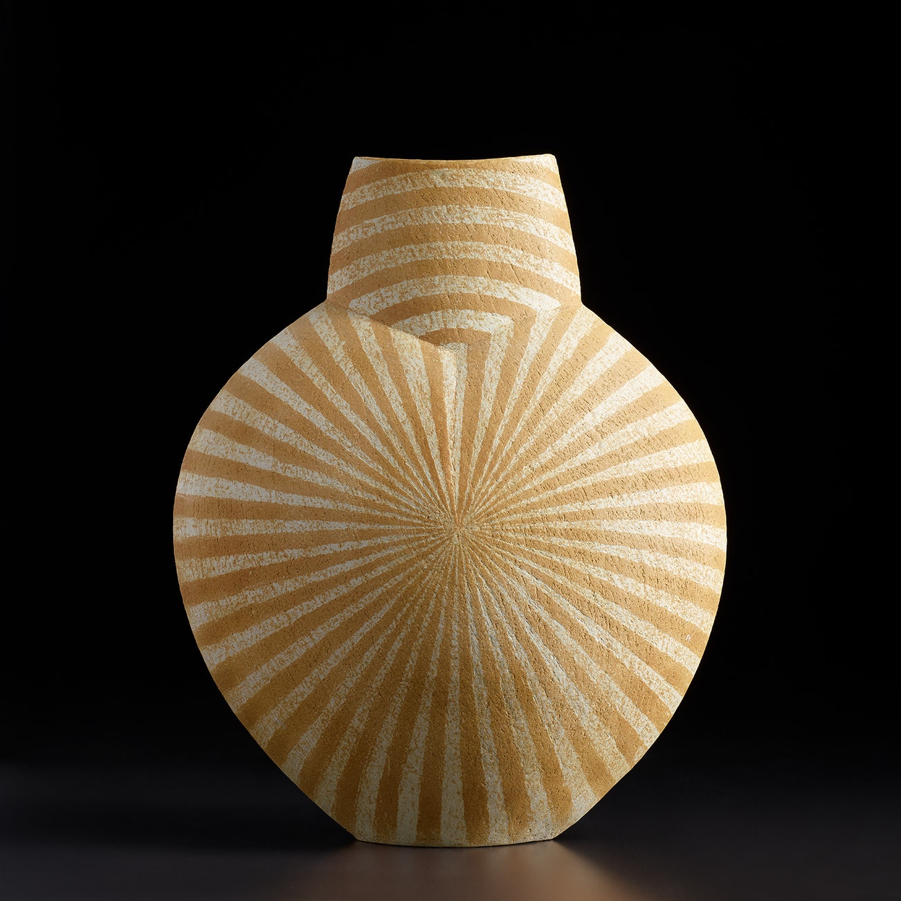 Stoneware, white and ochre glazes with a radiating banded design.
