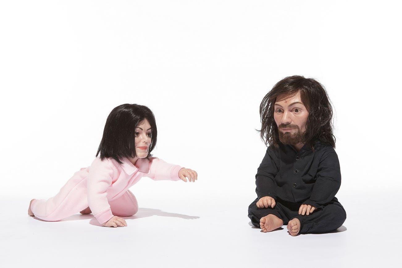 two figures comprised of silicone, human and synthetic hair, cotton flannel and polar fleece