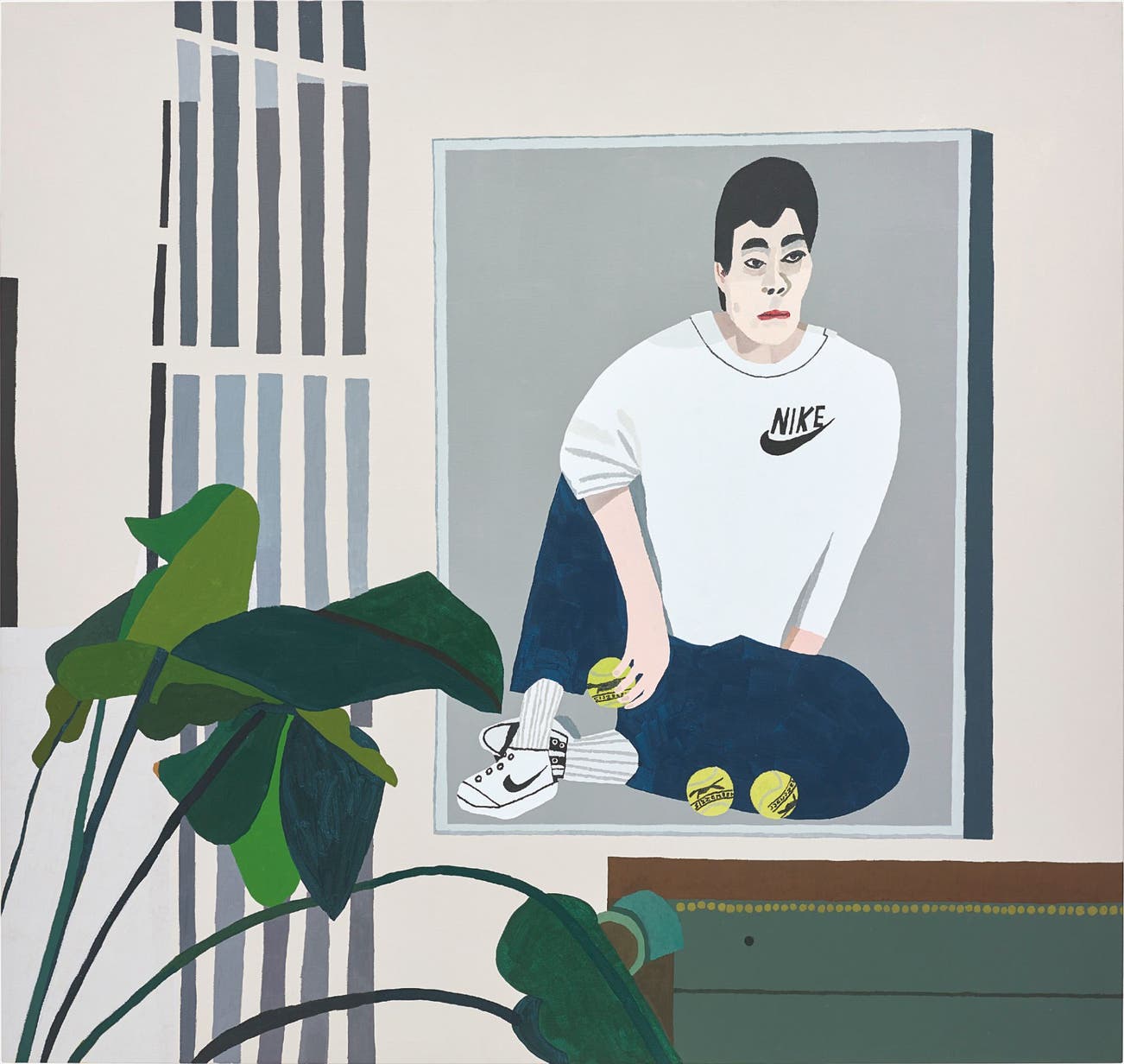 Wimbledon I may be initially perceived as the portrait of a resting tennis player. The full-bodied figure, dressed in sports attire with protruding Nike logos on both his sweatshirt and shoes, is holding one of three tennis balls. Yet, closer inspection quickly reveals this figure is actually a portrait hung within the context of a larger interior. The resulting sensation from this realisation is problematic. The pronounced linear angles which form this interior stress a lack of human presence. And yet, the imposing figure of the tennis player dominates the composition. By painting a painting on a wall, Wood interacts with the potential of his own creation. The implementation of multiple time narratives into a single, flat composition leads way to several interpretations. Are we faced with the portrait of a tennis player? Or is it to be merely understood as a decorated interior.