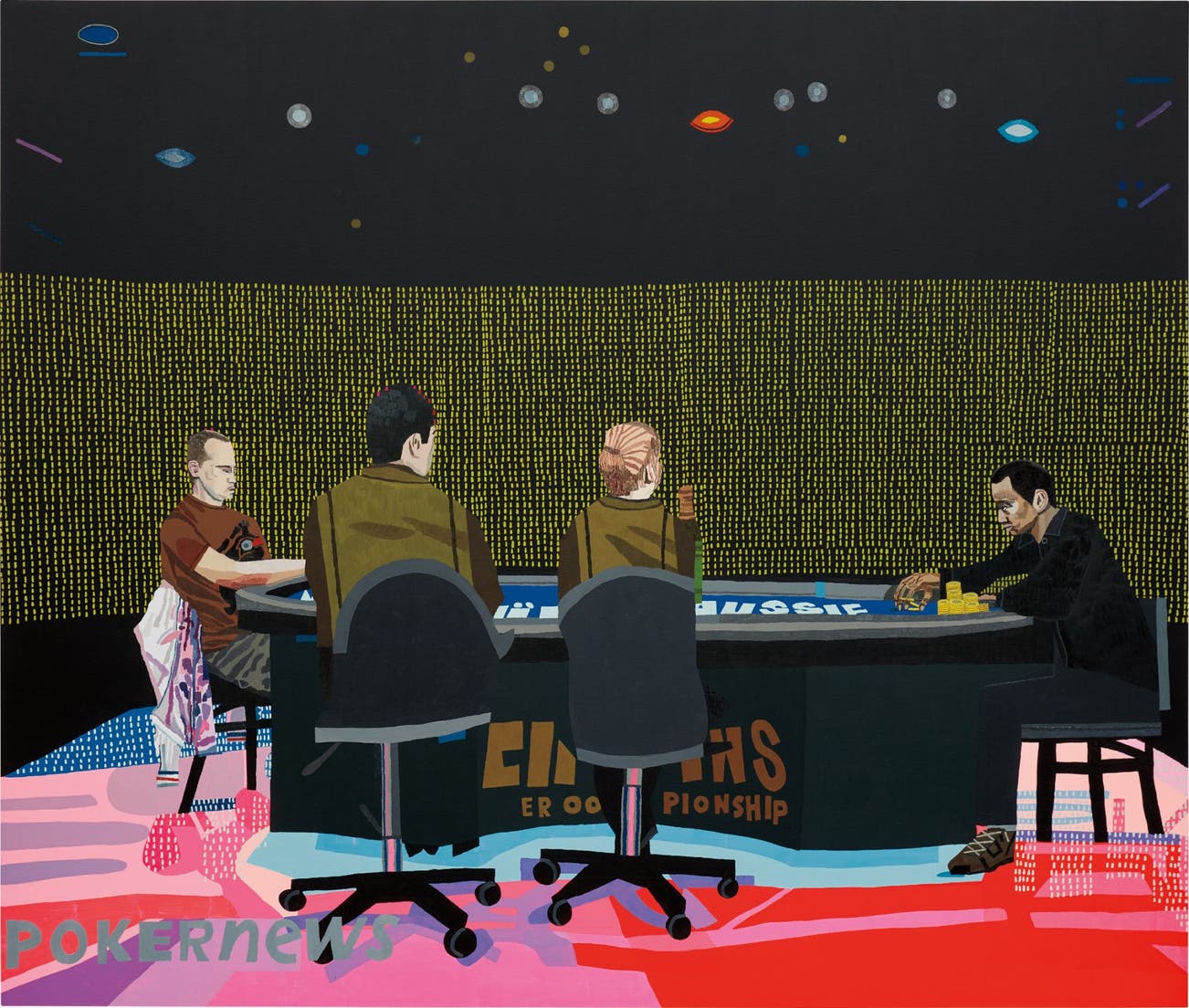 Suspended within a vast expanse of silky black pigment, a dizzying array of patterns and mosaic-like forms accumulate and scatter across a vast expanse of canvas. Executed in 2013, a constellation of planetary arrangements orbit the upper region of Head Up, as psychedelic panels of fuchsia and azure contrast with a golden pixelated partition to set the intimate scene of the poker game. The dramatic lighting, advertising text and tension masterfully created throughout the composition indicates that the stage is set for a climatic showdown. The linear scene of interaction at the apex of the canvas grounds the composition, bringing a heady mix of suspenseful motifs and intoxicating perspectives into an arrangement of pictorial reality.